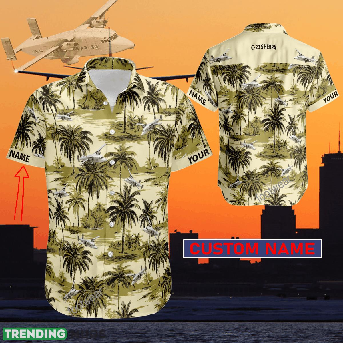 Aircraft Palms Tree Coconut C-23 Sherpa Hawaiian Shirt Hot Trending For Summer Custom Name Gift Details: