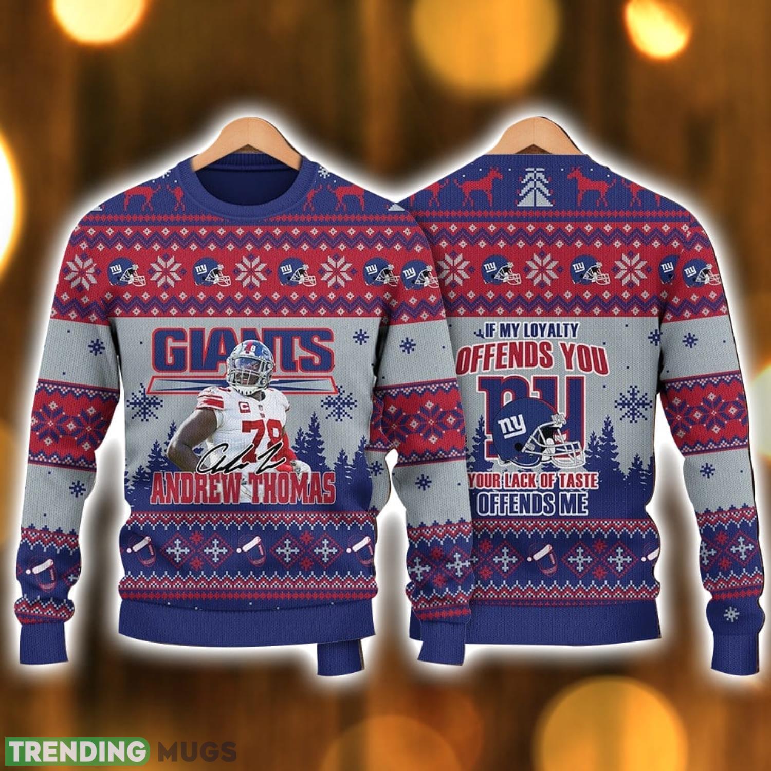 The Andrew Thomas New York Giants “Your Lack Of Taste Offends Me” NFL Ugly Christmas Sweater is the perfect Christmas gift for die-hard sport fans! This eye-catching sweater combines the festive spirit of the holiday season with your unwavering love for the New York Giants. Made with premium quality materials, it ensures both comfort and durability for all-day wear. The bold and amusing slogan, “Your Lack Of Taste Offends Me,” adds a playful touch, making it an ideal conversation starter at holiday parties or game nights. Whether you’re cheering on your favorite team from the comfort of your couch or spreading holiday cheer at the stadium, this festive sweater will keep you warm and stylish. Show off your team spirit with pride and make a statement this Christmas season with the Andrew Thomas New York Giants Ugly Christmas Sweater!