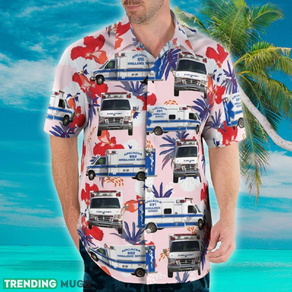 Featuring a vibrant Hawaiian print, this shirt showcases a stunning combination of colors and patterns that will surely turn heads wherever you go. The Arcadia Ambulance Service logo adds an extra touch of authenticity and uniqueness, making this shirt a must-have for fans and collectors alike.