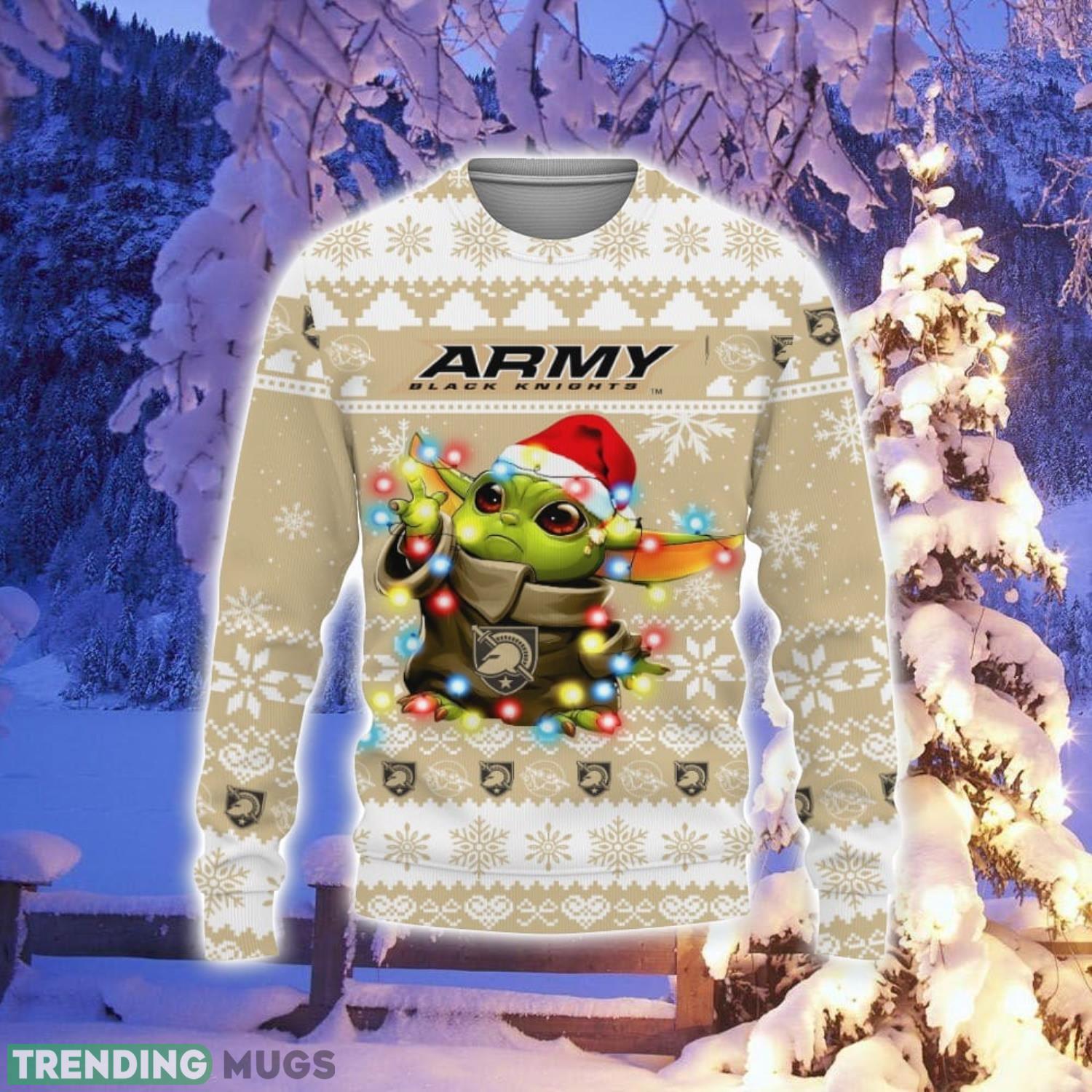 Crafted with the utmost care and attention to detail, this Christmas sweater features a vibrant and playful design that will have heads turning at any holiday gathering. The combination of the Army Black Knights logo, Baby Yoda, and festive Christmas elements creates a one-of-a-kind look that truly captures the spirit of the season.