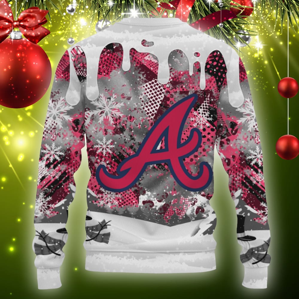 Featuring a vibrant all-over print design, this cozy sweater showcases Snoopy dabbing in a sporty Atlanta Braves outfit, surrounded by festive Christmas elements. The intricate details and dripping effects add a touch of uniqueness to this one-of-a-kind ugly Christmas sweater.