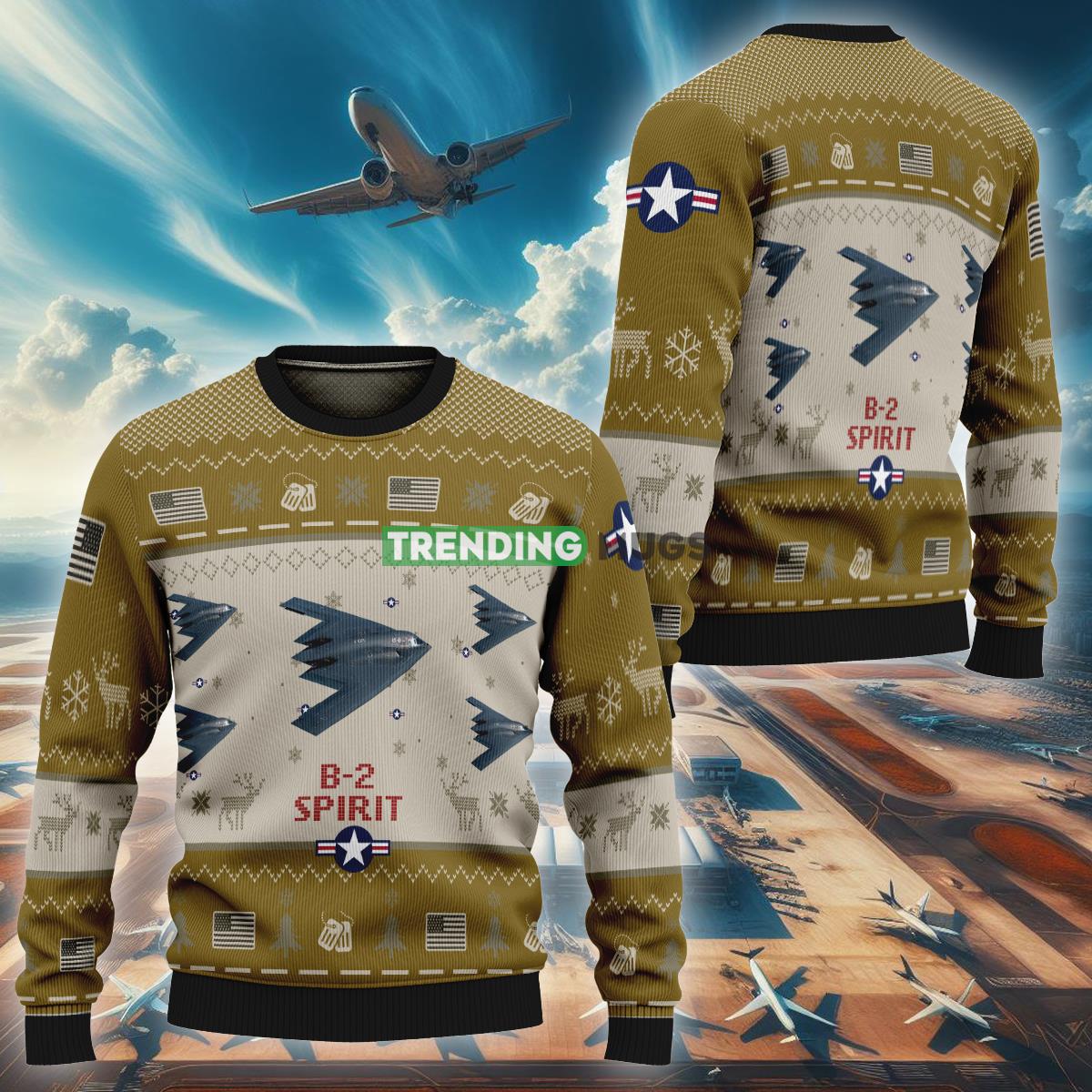 Featuring a festive design inspired by the legendary B-2 Spirit Aircraft, this sweater combines style and patriotism in one fabulous package. The rich brown color complements the intricate details of the aircraft, making it a true standout during those cozy holiday gatherings.