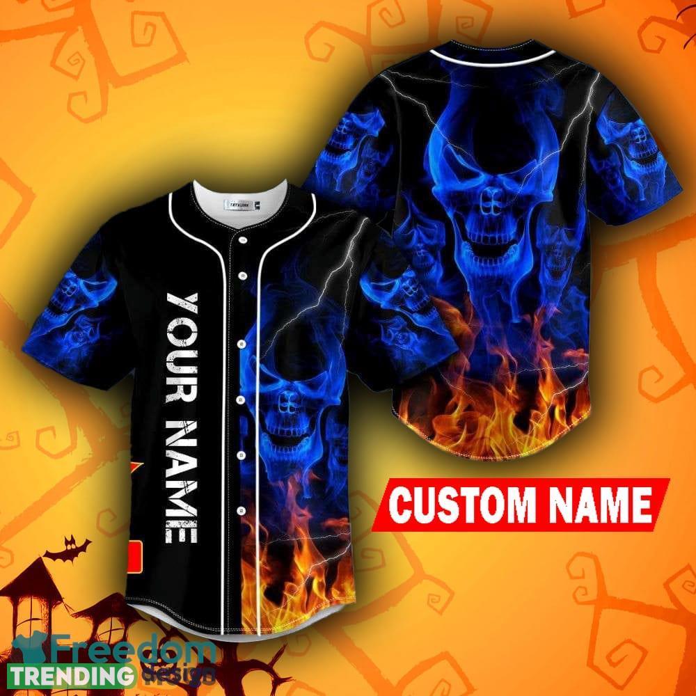 Blue Smoke Skeleton Fire Halloween Skull Holiday Baseball Jersey Shirt Custom Name Information: