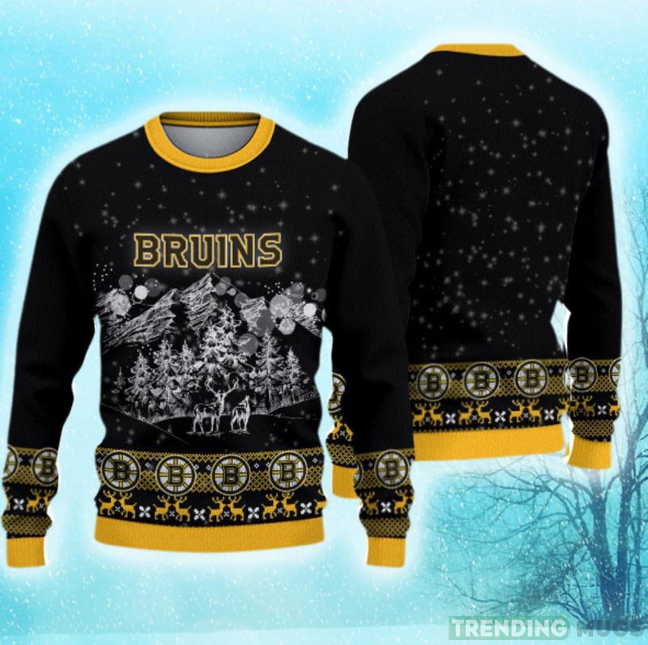 Designed with the iconic Boston Bruins logo and colors, this sweater is the perfect way to showcase your team spirit during those chilly winter months. The intricate detailing of the Christmas mountain scenery adds a touch of whimsy and charm, making it a truly captivating piece.