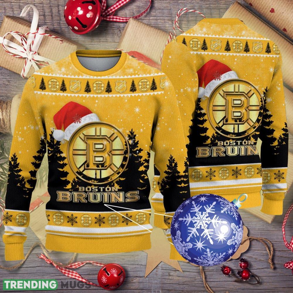Featuring the iconic Boston Bruins logo adorned with golden accents, this sweater is a must-have for any dedicated fan. The festive Santa hats and Christmas trees add a playful touch that will surely make you the center of attention at any holiday gathering. Whether you’re heading to a family dinner or an ugly Christmas sweater party, this sweater is sure to make a statement.