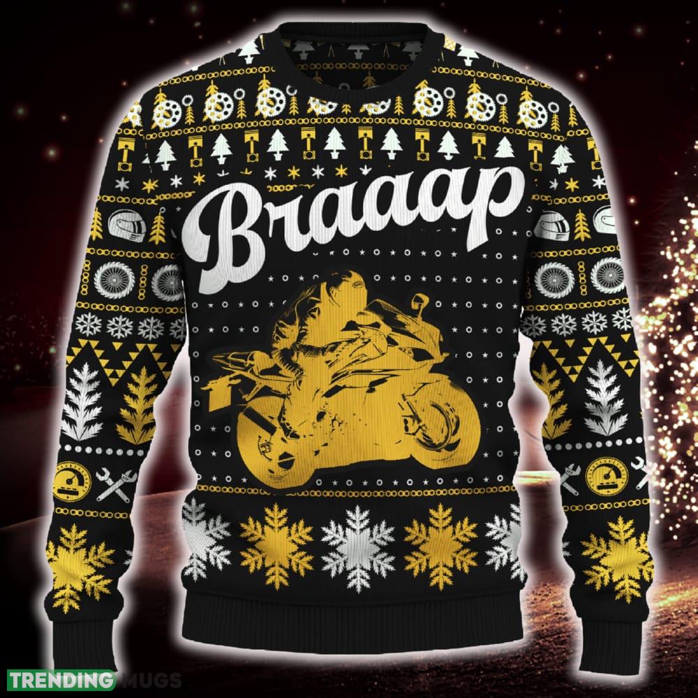 Crafted with the utmost attention to detail, this sweater features a stunning all-over print design that showcases the iconic Braaap YZF-R1 motorbike merged with delicate snowflakes. The result? A truly one-of-a-kind garment that will make heads turn at every holiday gathering.