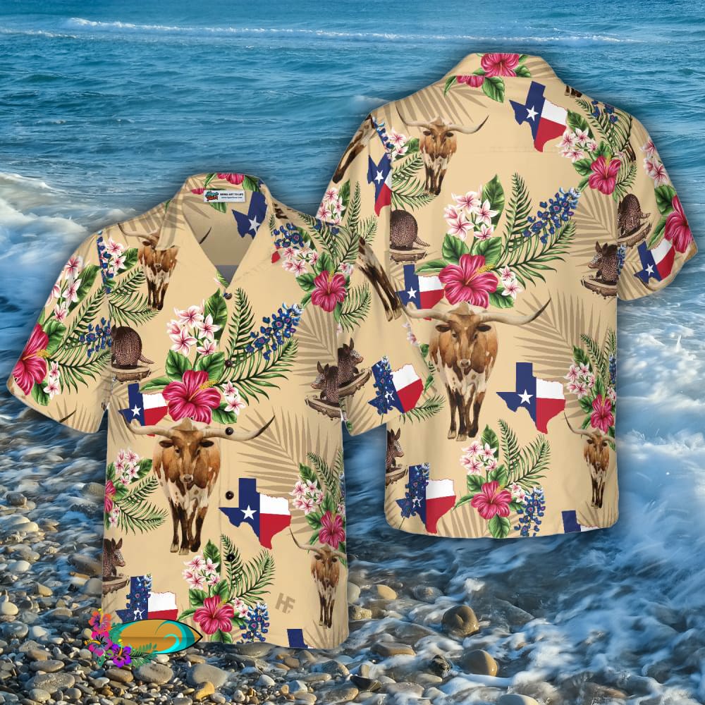 Brown Tribal Pattern Texas 3D Hawaiian Shirt For Men, Armadillo And Longhorn Texas State Shirt, Proud Texas Flag Shirt For Men Details: