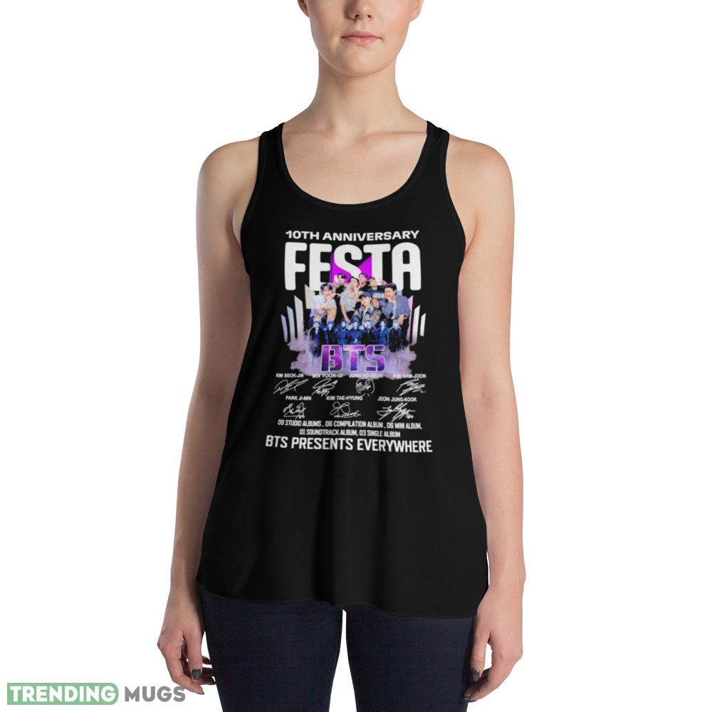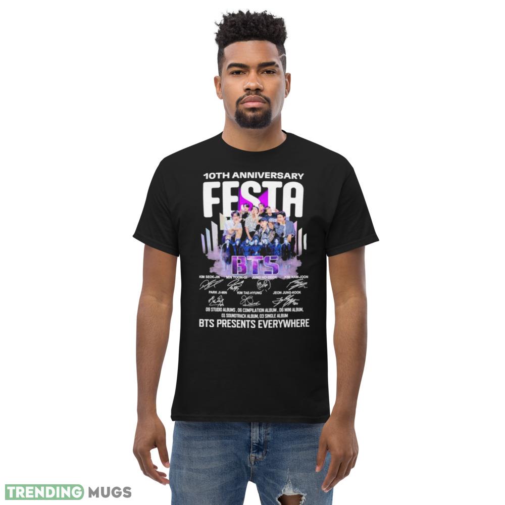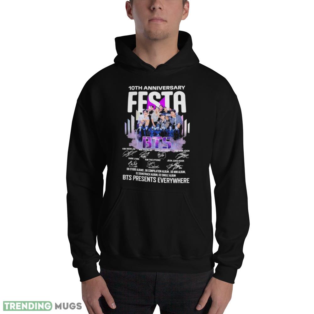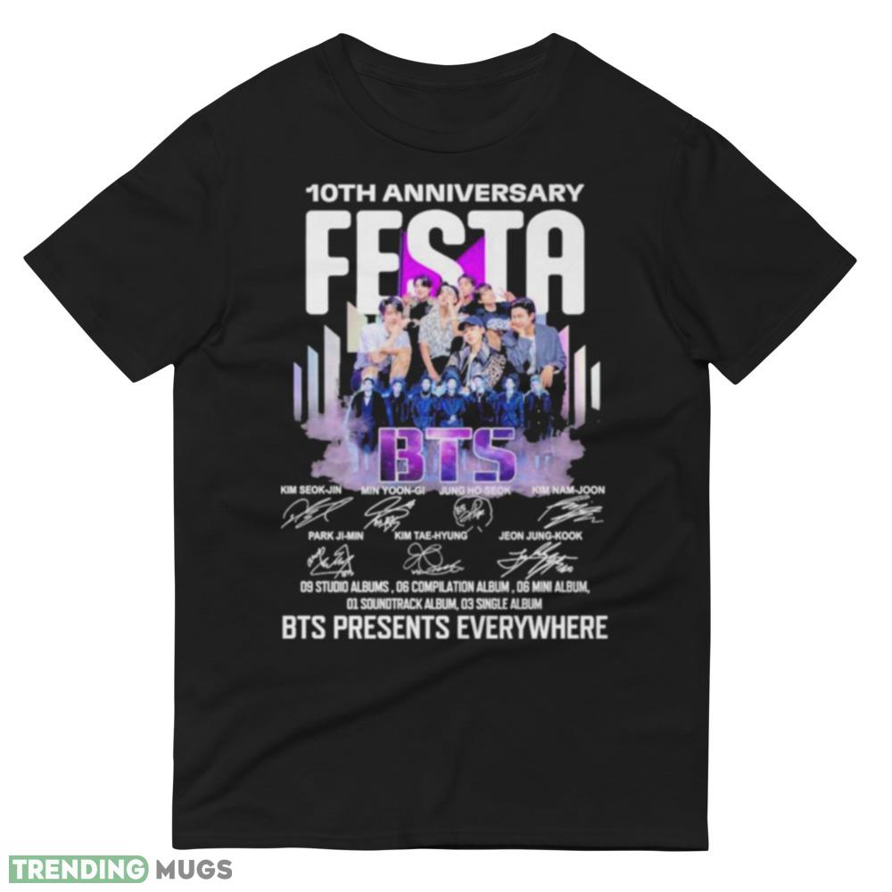 Celebrate the 10th anniversary of BTS Festa with our BTS Presents everywhere signatures shirt! This shirt is the perfect way to show your love for the iconic K-pop group while also commemorating their milestone celebration. Featuring signatures from all members of BTS, this shirt is a true collector’s item that any fan would be proud to own. Made with high-quality materials and a comfortable fit, you’ll want to wear this shirt everywhere you go. Don’t miss out on this limited edition piece of BTS history – order yours today!