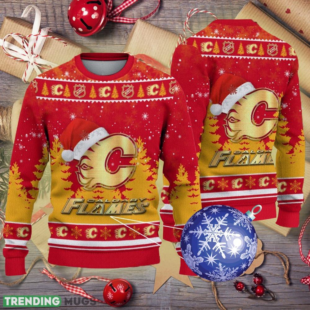 Whether you’re cheering on your favorite team during the game or spreading holiday joy, our Calgary Flames Logo Golden Fans Santa Hat Tree Ugly Xmas 3D Sweater is the perfect choice. Don’t miss out on this must-have festive apparel – order yours today and make a statement this holiday season!
