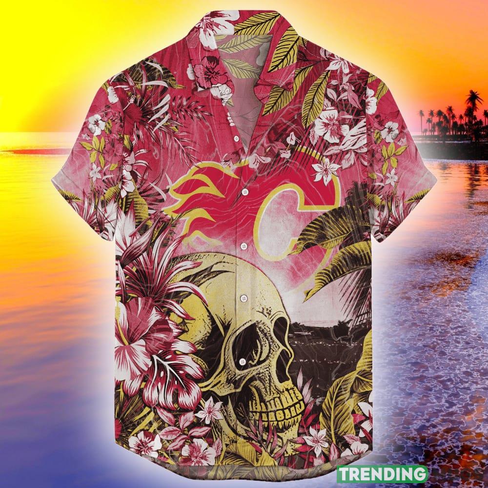 Surprise a Flames enthusiast in your life with this one-of-a-kind gift. Perfect for birthdays, anniversaries, or special occasions, our Calgary Flames NHL Tropical Skull Hawaii Shirt is sure to bring a smile to their face. Show off your team pride and embrace the island vibes with this must-have shirt. Order yours today and join the ranks of stylish Flames fans!
