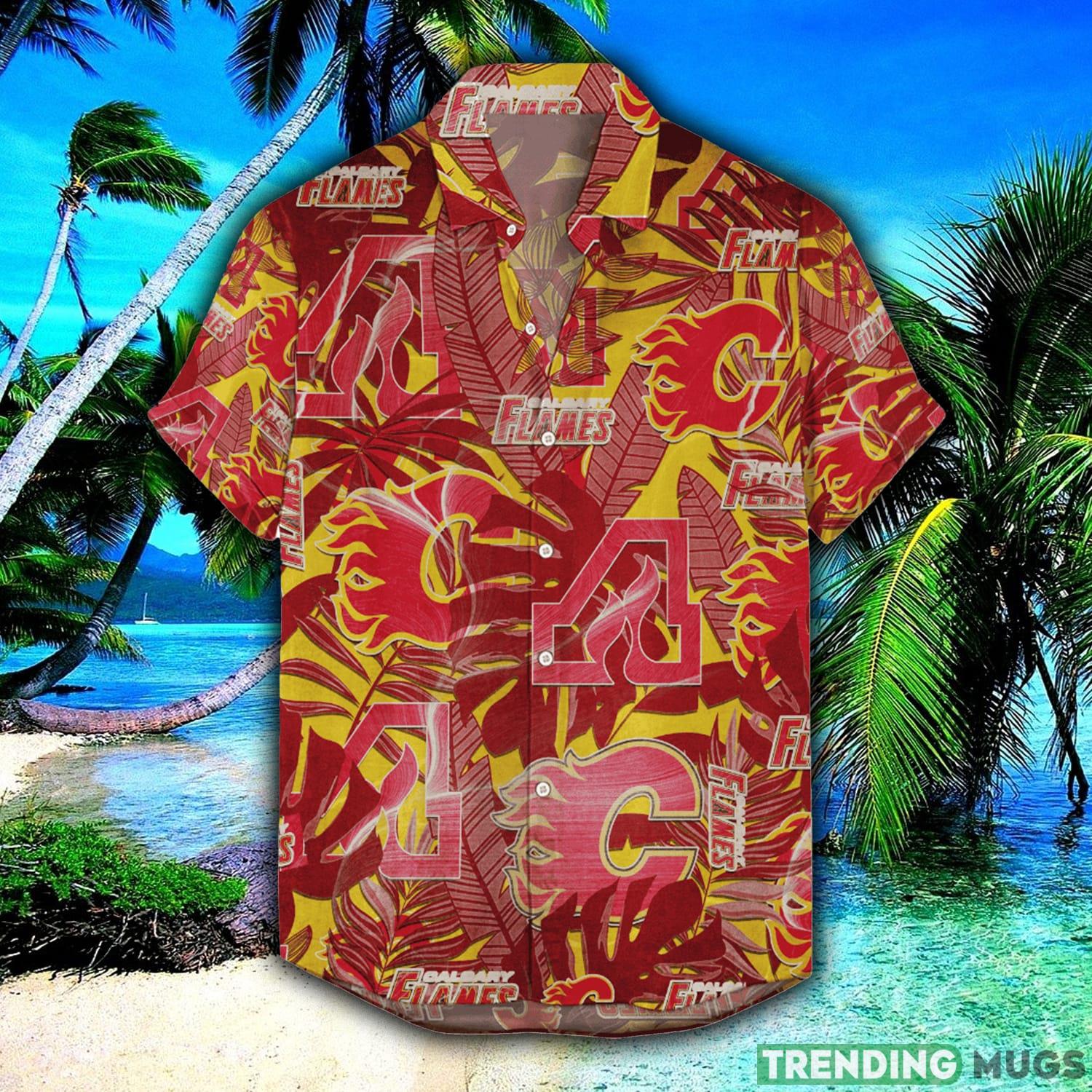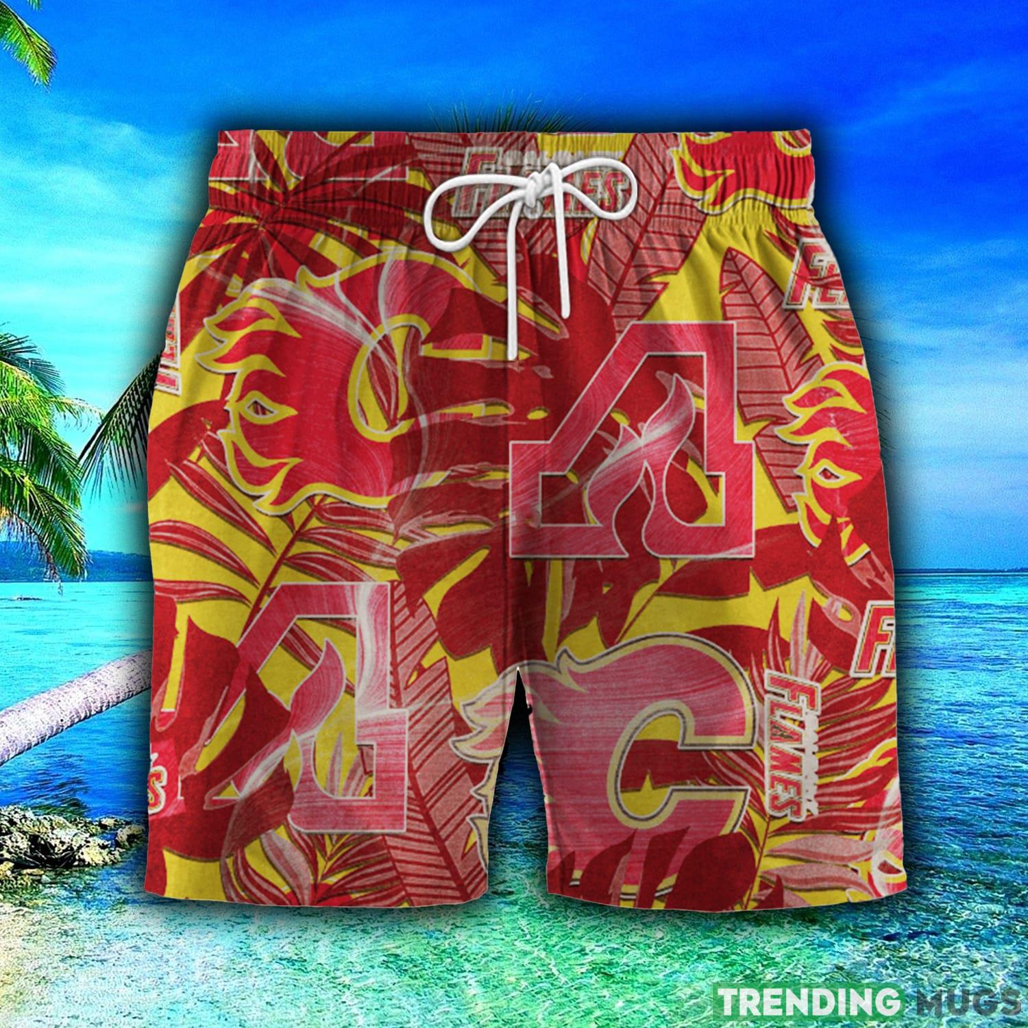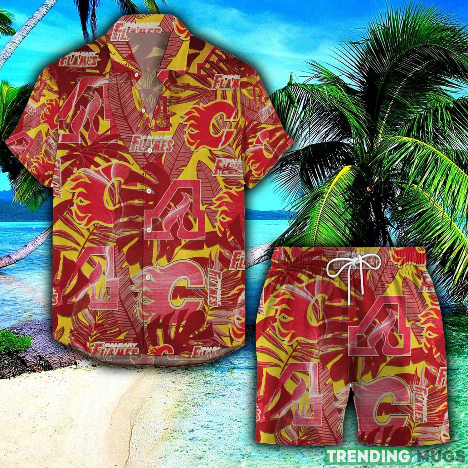 Crafted with utmost attention to detail, this Hawaiian shirt and shorts combo features the iconic Calgary Flames logo in a vibrant and retro 3D design. The shirt’s bold and colorful pattern showcases your love for the team in a unique and fashion-forward way.