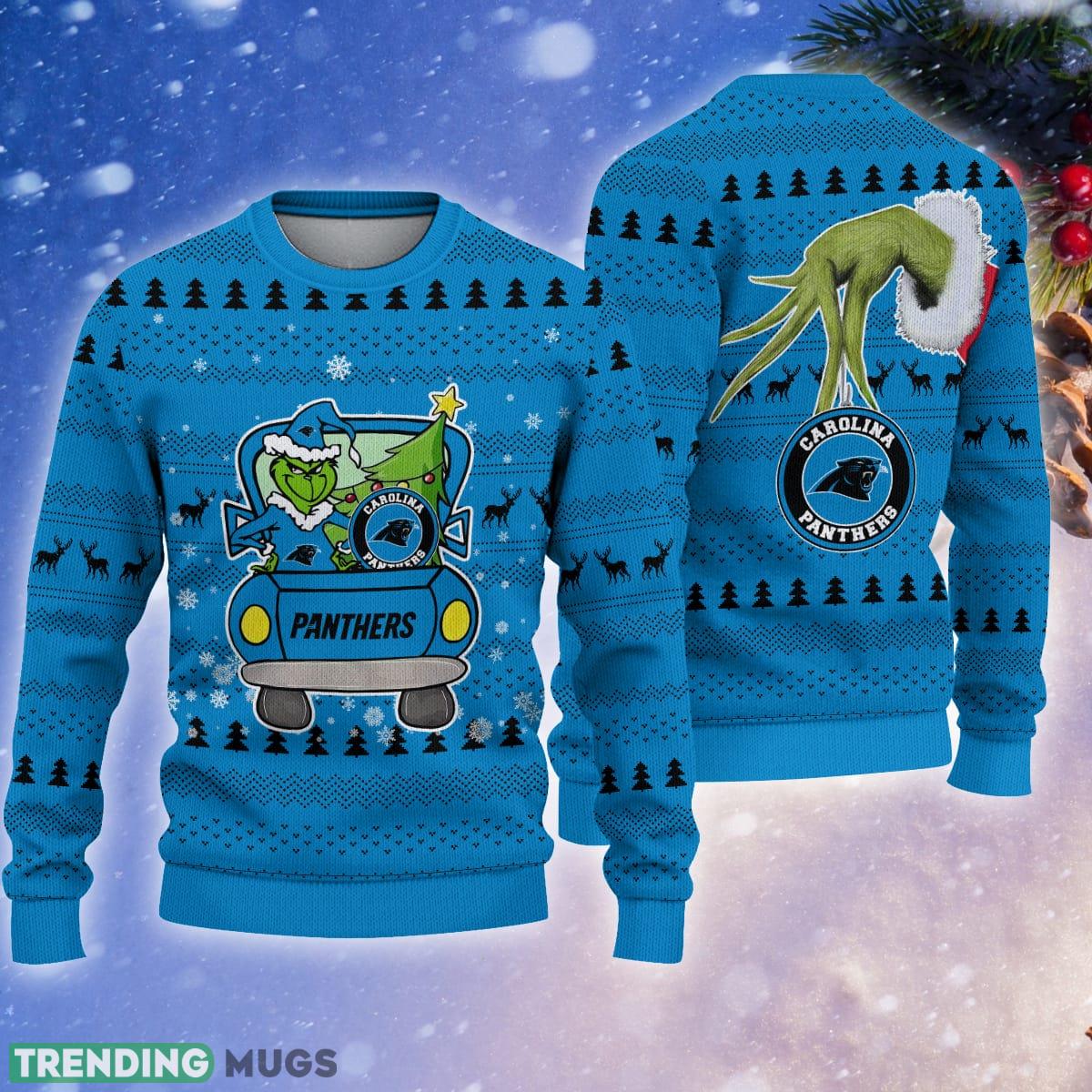 Crafted with love and attention to detail, this sweater features a vibrant and intricate design of the Carolina Panthers logo alongside the mischievous Grinch driving through a winter wonderland of pine trees. The combination of these beloved motifs creates a playful and joyful atmosphere, making it an ideal gift for any die-hard Panthers fan or Grinch enthusiast.