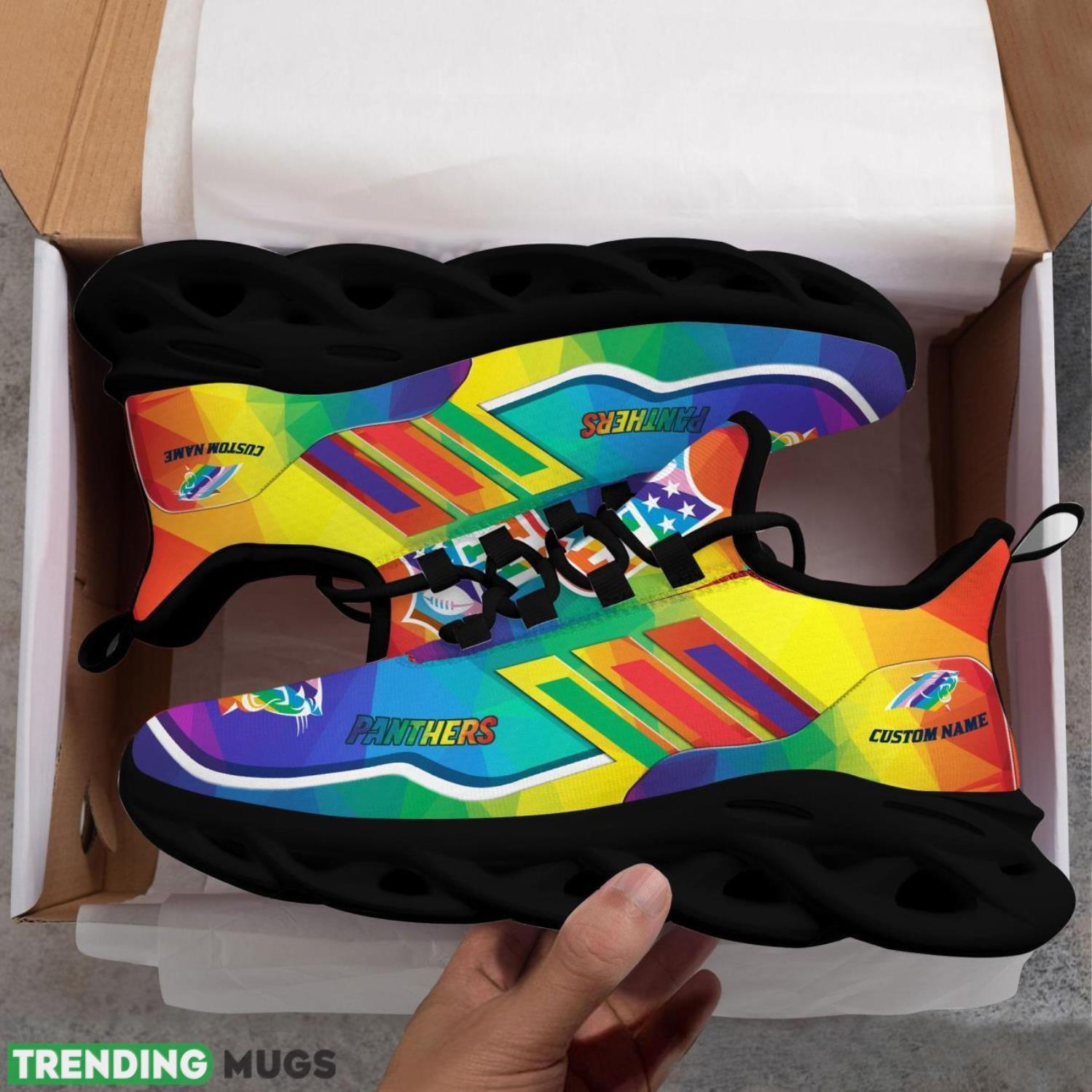 This Carolina Panthers NFL Team LGBT Pride Sneakers Max Soul Shoes is a breathable, lightweight, and comfortable casual outdoor shoe that has a unique design. It is made of a mesh fabric which makes it sweat absorbent and breathable, while the rubber bottom ensures traction, comfort, and durability. It is available in two colors: black or white sole. There are two styles of shoelace holes so you can choose your preference.