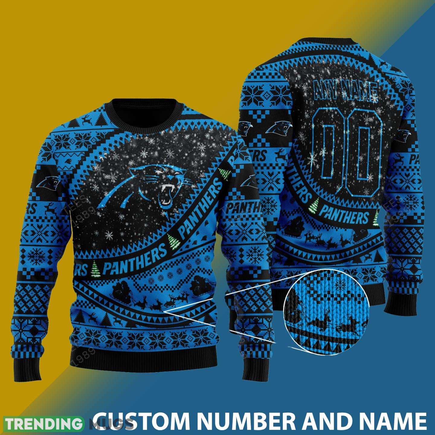 What sets this sweater apart is the ability to customize it with your very own name and number. Show off your loyalty to your favorite player or create a personalized touch that makes this sweater truly your own. Whether you’re attending a game, hosting a holiday party, or simply want to showcase your team spirit, this customized sweater is a must-have for any die-hard Carolina Panthers fan.