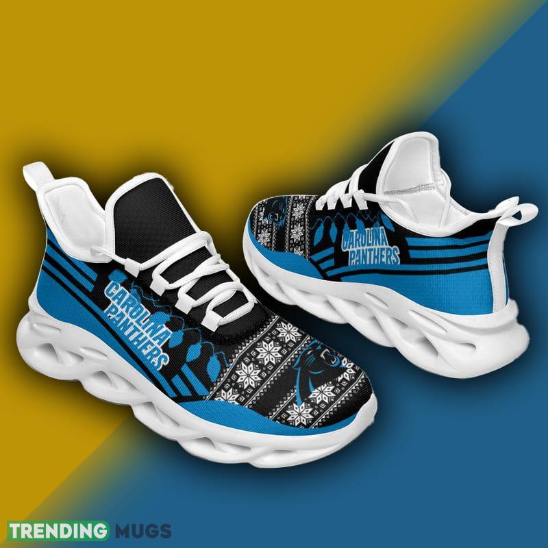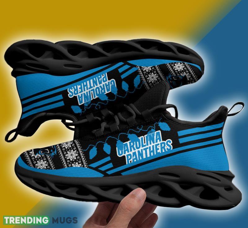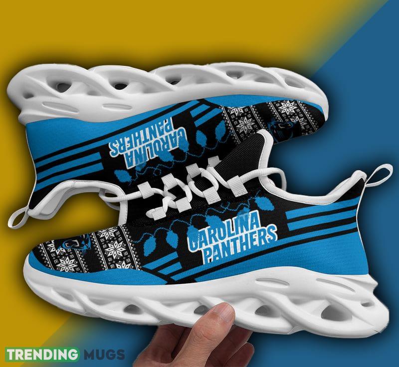 This Carolina Panthers X-max Santa Claus Max Soul Shoes Athleisure Christmas Sneakers is a breathable, lightweight, and comfortable casual outdoor shoe that has a unique design. It is made of a mesh fabric which makes it sweat absorbent and breathable, while the rubber bottom ensures traction, comfort, and durability. It is available in two colors: black or white sole. There are two styles of shoelace holes so you can choose your preference.