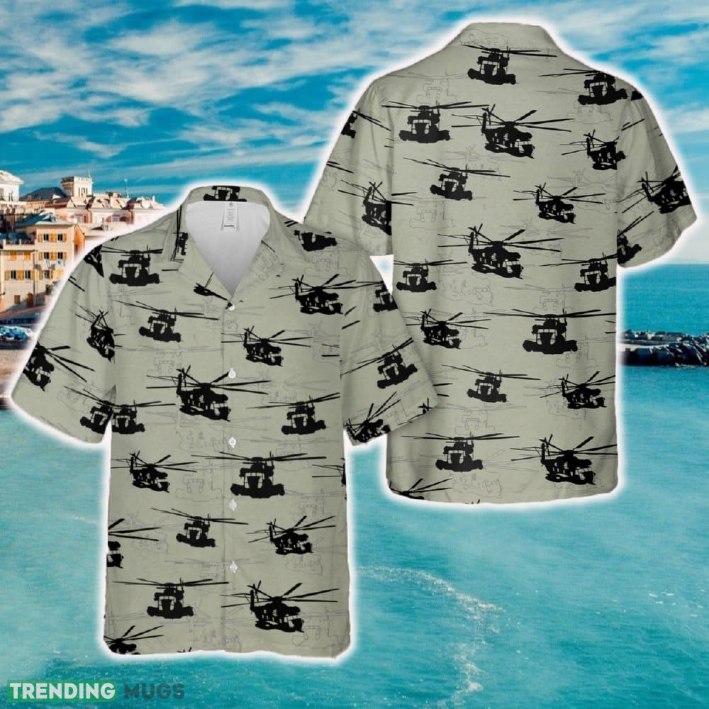 Crafted with utmost attention to detail, our Hawaiian shirt features a comfortable and lightweight fabric that will keep you cool and stylish all day long. The vibrant print showcases the sleek contours of the CH-53 helicopter, adding a touch of excitement and uniqueness to your wardrobe.