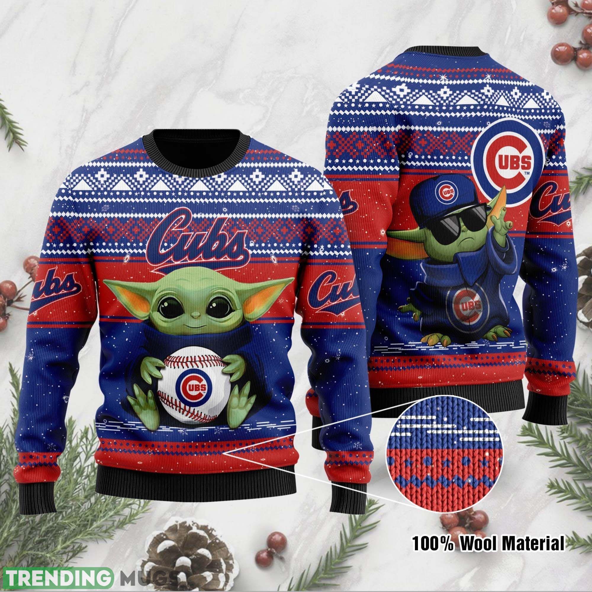 Featuring a delightful combination of the iconic Chicago Cubs logo and the adorable Baby Yoda, this sweater is a true conversation starter. The design showcases Grogu, affectionately known as Baby Yoda, giving a warm hug to the Cubs logo, creating a unique and playful twist on the classic ugly Christmas sweater.