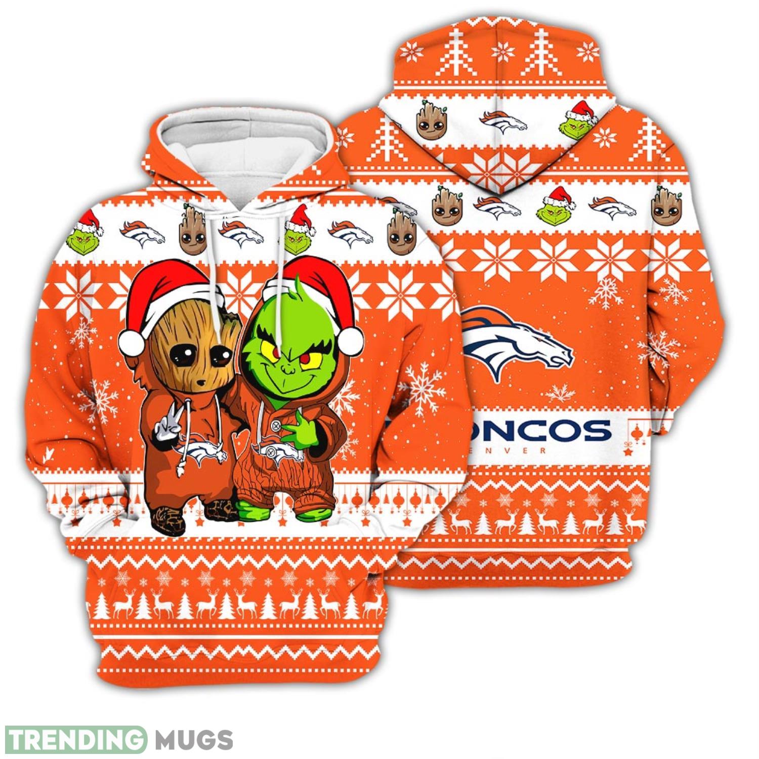 Some of the Christmas Hoodie Denver Broncos Baby Groot And Grinch Best Friends Unisex 3D Hoodie photos