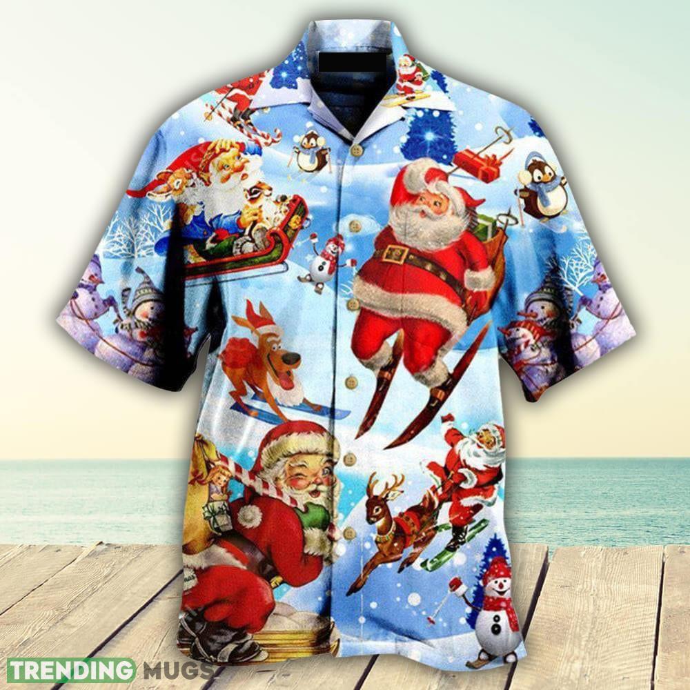 The shirt features Santa Claus skiing down the slopes, complete with his red hat and white beard. The Hawaiian print adds a fun and tropical twist to the traditional Christmas shirt. It’s the perfect combination of holiday spirit and island vibes.
