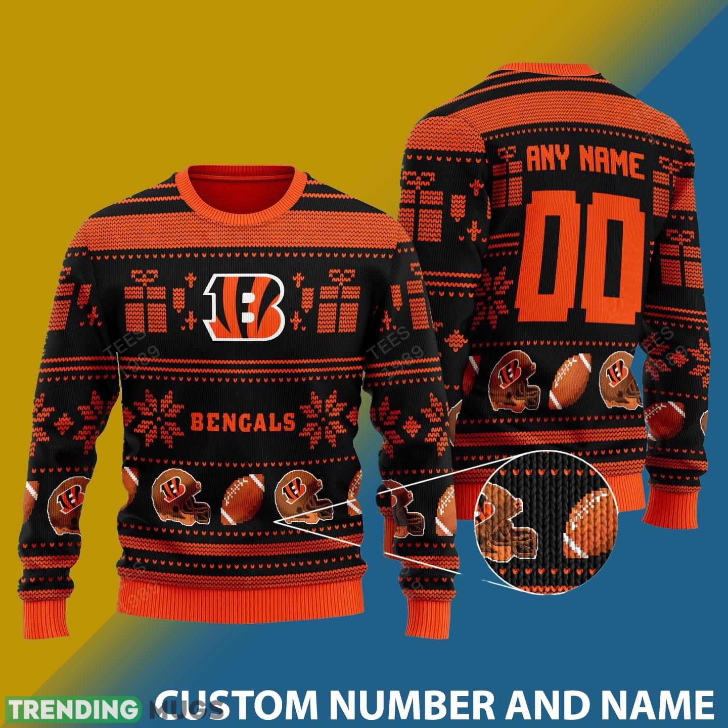 Get ready to show off your team spirit with our Cincinnati Bengals Design NFL Snowflakes Reindeer 3D Sweater Custom Number And Name! This one-of-a-kind sweater is the perfect addition to your winter wardrobe. Made with the utmost attention to detail, our sweater features a unique design showcasing the iconic Cincinnati Bengals logo surrounded by festive snowflakes and reindeer.
