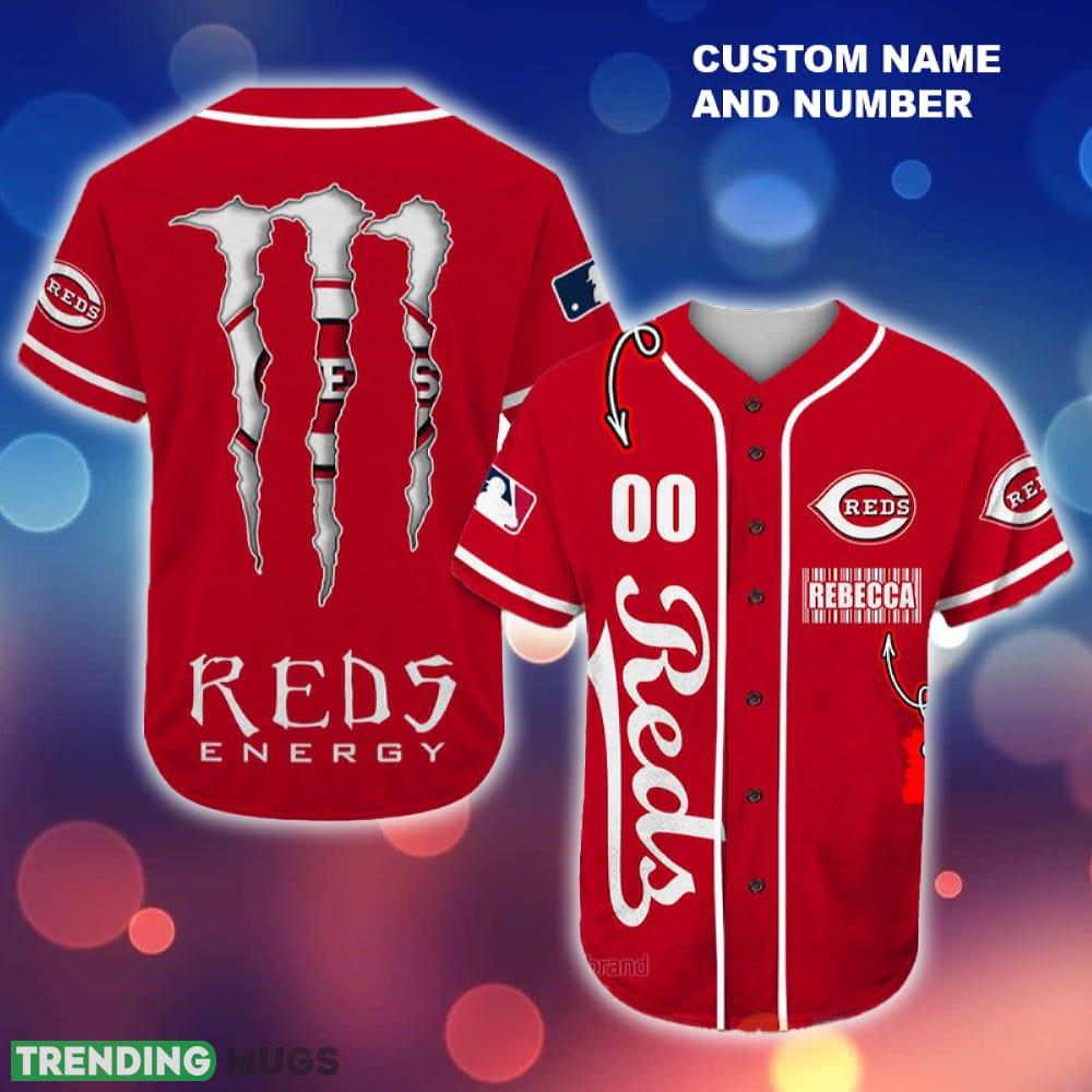 Show your support for the Cincinnati Reds in style with this custom Monster Energy MLB Baseball Jersey Shirt. Personalize it with your own name and number to feel like a part of the team. Made with high-quality materials, this shirt is perfect for game day or any casual outing. Stand out from the crowd and represent your favorite team with pride in this unique and eye-catching jersey shirt. Order yours today and show off your Reds spirit!