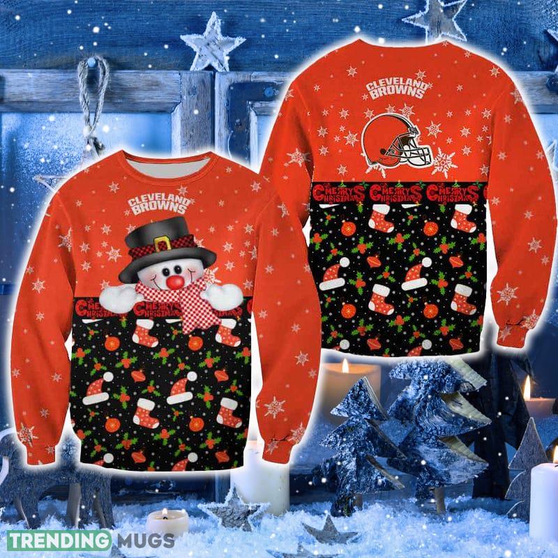 Designed with the festive spirit in mind, this sweater features an adorable snowman wearing the iconic Cleveland Browns logo, adding a touch of team spirit to your holiday wardrobe. The vibrant colors and intricate detailing make this sweater a standout piece at any holiday gathering or game day party.