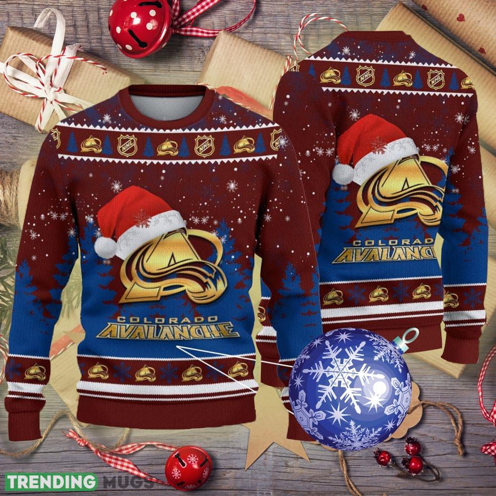 Crafted with the utmost care, our sweater features a beautifully knitted design that showcases the iconic Colorado Avalanche logo, adorned with golden Christmas tree motifs and Santa hats. The intricate detailing and vibrant colors make this sweater a standout piece at any holiday gathering or game night.
