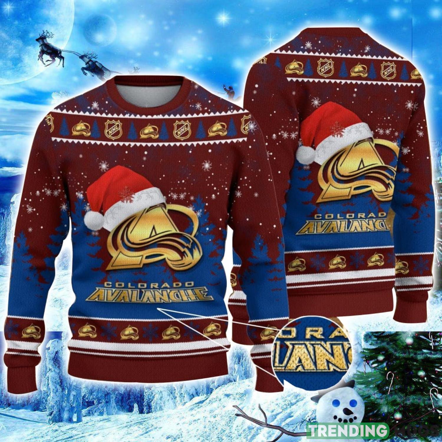 Don’t miss out on the opportunity to celebrate the holidays in style. Order your Colorado Avalanche Logo Wearing Santa Hat Christmas Gift Ugly Christmas Sweater today and make this holiday season one to remember!