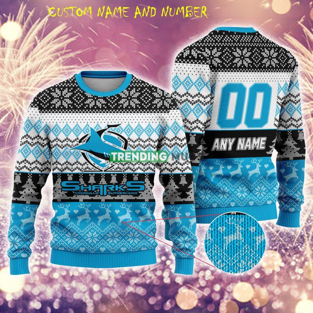 Some of the Cronulla Sutherland Sharks NRL Christmas Cute 3D Ugly Sweater Gift For Men And Women Custom Number And Name photos