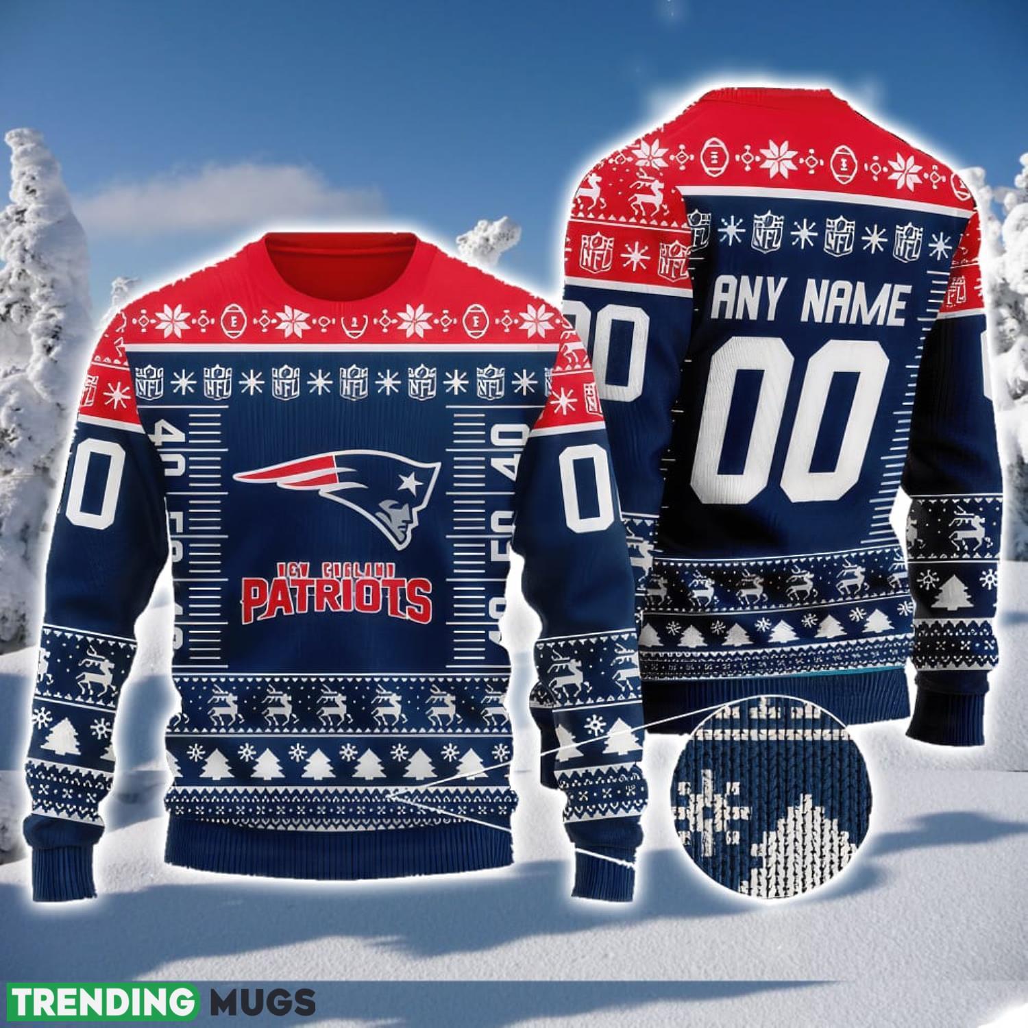 Crafted with meticulous attention to detail, this sweater features the iconic Patriots logo proudly displayed on the front, surrounded by a festive holiday design. But what sets this sweater apart is the customizable touch it offers. With the option to add your name and favorite player’s number to the back, you can truly make it your own.