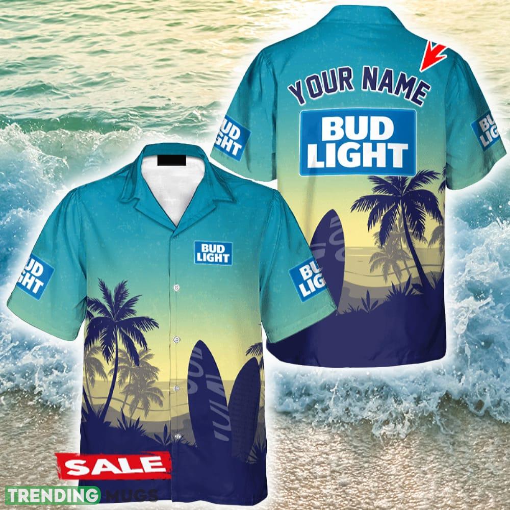Custom Name Bud Light Palm Tree Surfboard Hawaiian Shirt Beer Holidays Summer