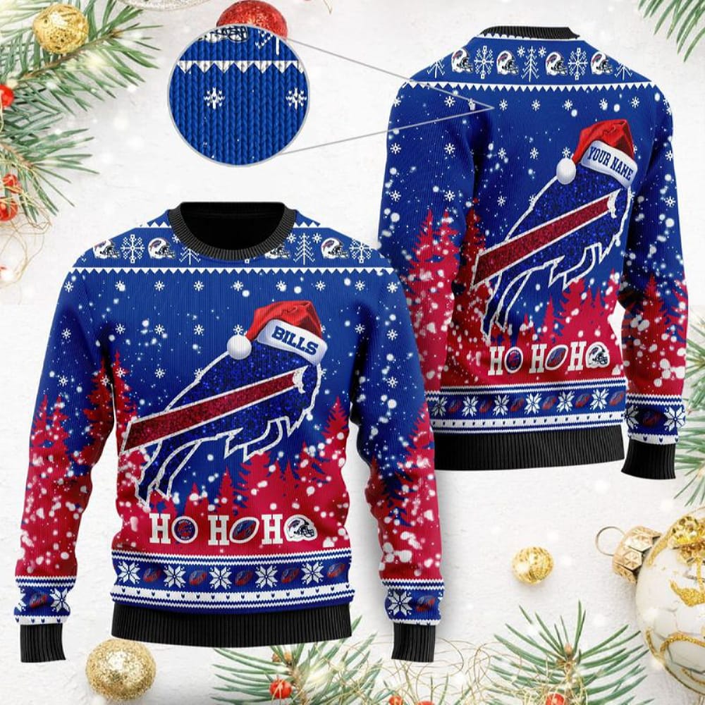 Custom Name Buffalo Bills Symbol Wearing Santa Claus Hat Cute Pattern Ho Ho Ho All Over Print Sweater Gift Christmas Informations: