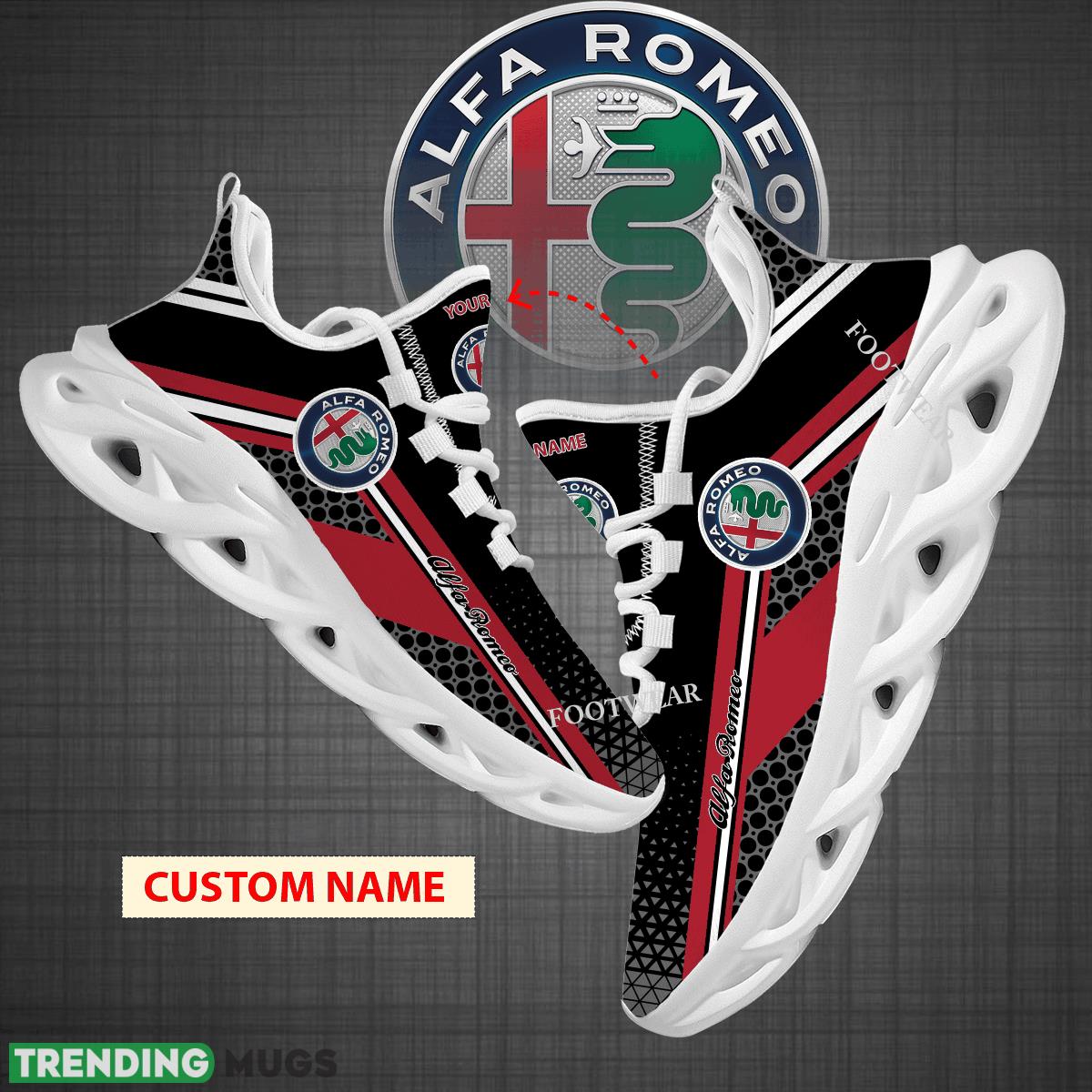 This Custom Name Car Racing Alfa Romeo Logo New Design Max Soul Shoes For Big Fans Runing Sneakers Gift is a breathable, lightweight, and comfortable casual outdoor shoe that has a unique design. It is made of a mesh fabric which makes it sweat absorbent and breathable, while the rubber bottom ensures traction, comfort, and durability. It is available in two colors: black or white sole. There are two styles of shoelace holes so you can choose your preference.