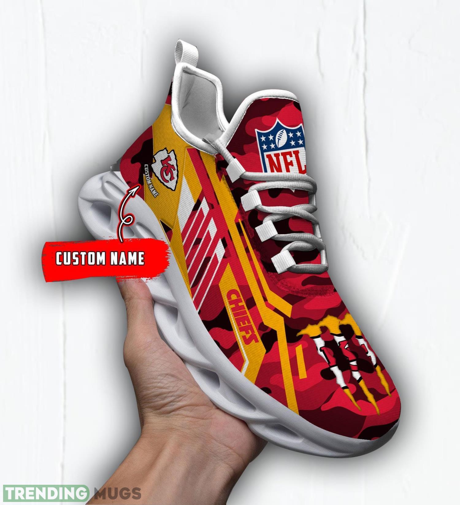 This Custom Name Gift Kansas City Chiefs Camo Striped Style Max Soul Shoes For Fans is a breathable, lightweight, and comfortable casual outdoor shoe that has a unique design. It is made of a mesh fabric which makes it sweat absorbent and breathable, while the rubber bottom ensures traction, comfort, and durability. It is available in two colors: black or white sole. There are two styles of shoelace holes so you can choose your preference.