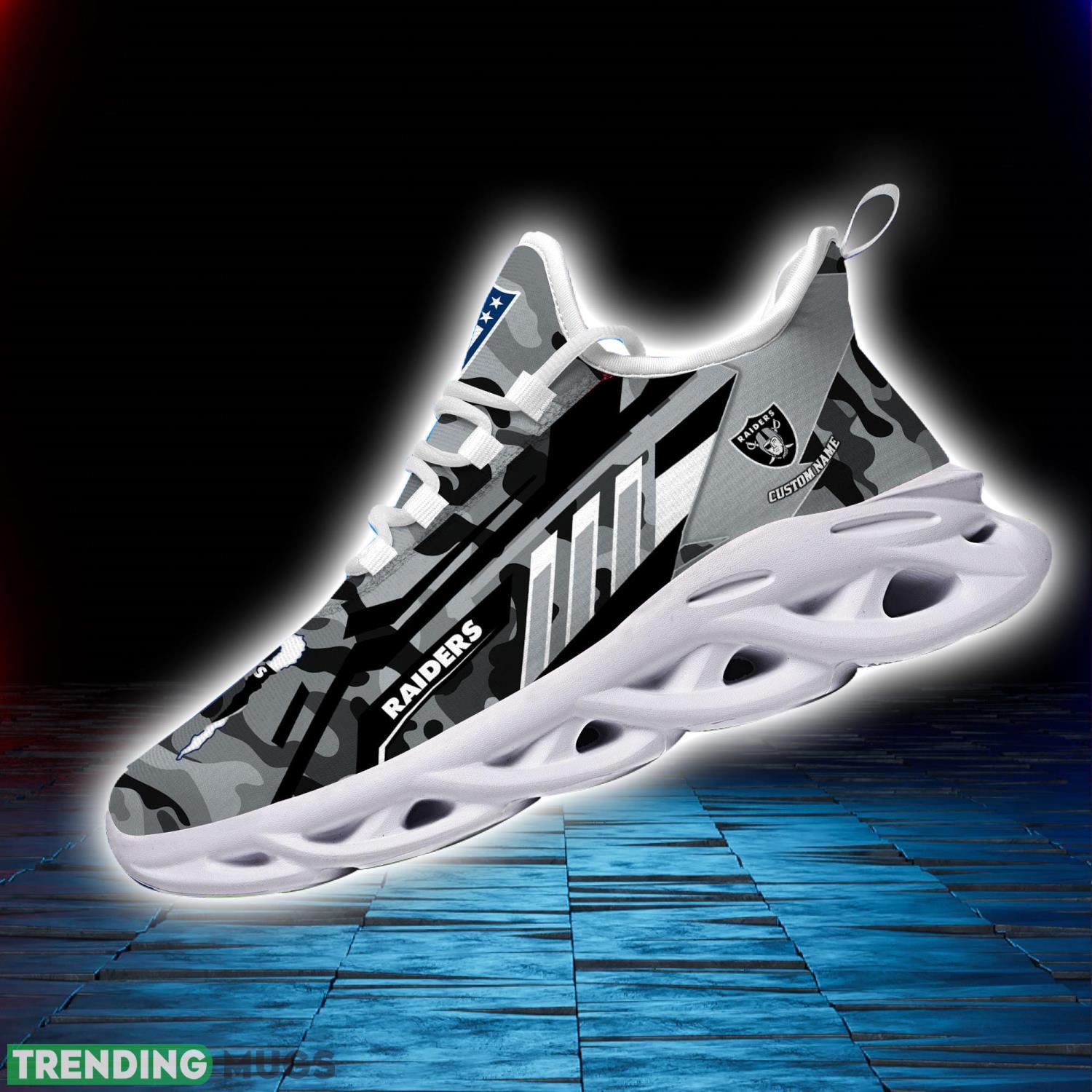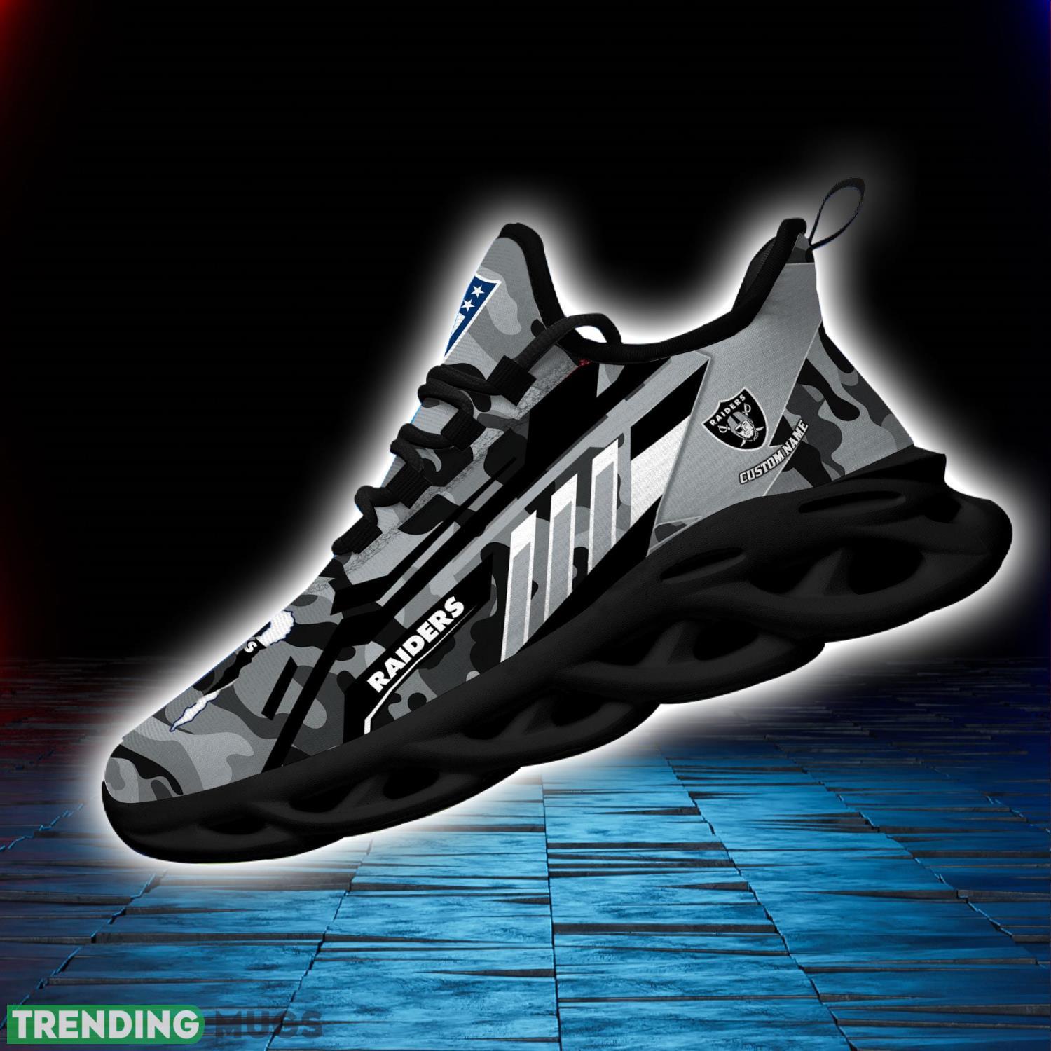 Elevate your game day style with our Custom Name Gift Las Vegas Raiders Camo Striped Style Max Soul Shoes For Fans! Designed for ultimate comfort and adorned with the iconic Raiders logo, these shoes are a must-have for any true fan. The unique camo striped pattern adds a trendy touch, making these shoes a standout choice both on and off the field.