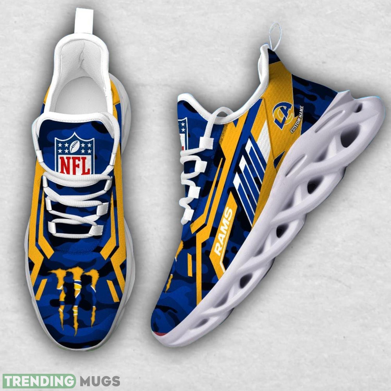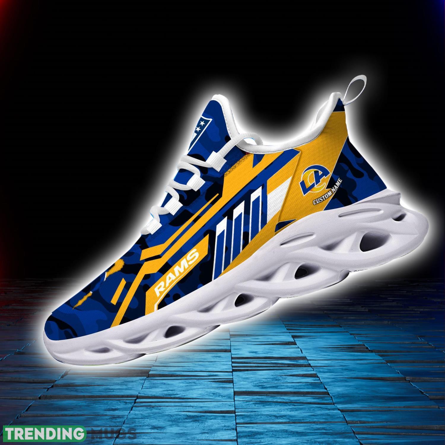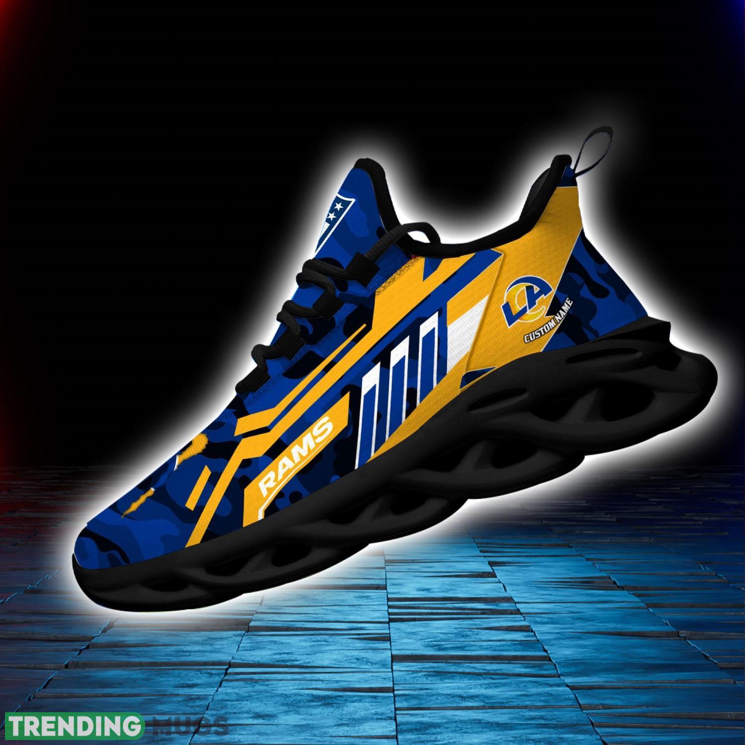 Elevate your fan game with our Custom Name Gift Los Angeles Rams Camo Striped Style Max Soul Shoes! Perfect for die-hard Rams supporters, these shoes are a stylish way to show off your team pride.
