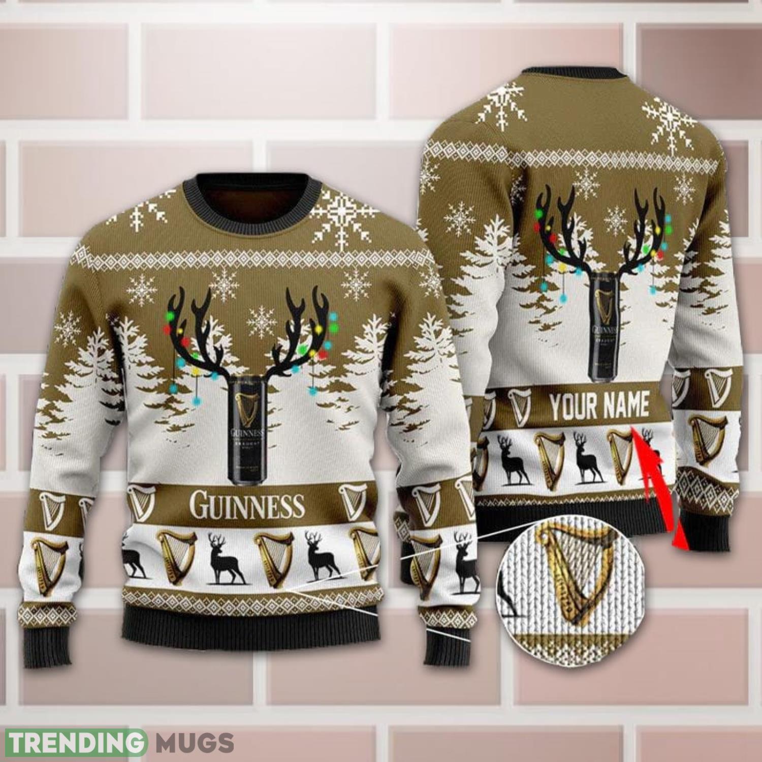 Featuring the iconic Guinness logo and a playful Christmas-themed design, this sweater is a true showstopper. The all-over print adds a modern twist, ensuring you’ll be the center of attention at any holiday gathering. But what truly sets this sweater apart is the ability to add your own custom name, making it a truly unique and personalized piece.