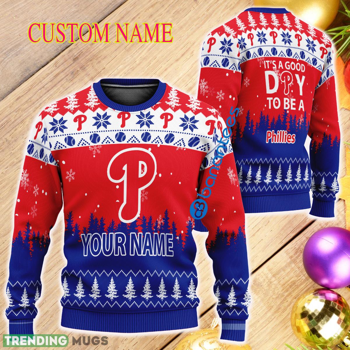 Spread the joy and celebrate the holiday season with our Custom Name It A Good Day To Be A Philadelphia Phillies Ugly Christmas Sweater. Order now and let your love for the Phillies shine bright during the most wonderful time of the year!