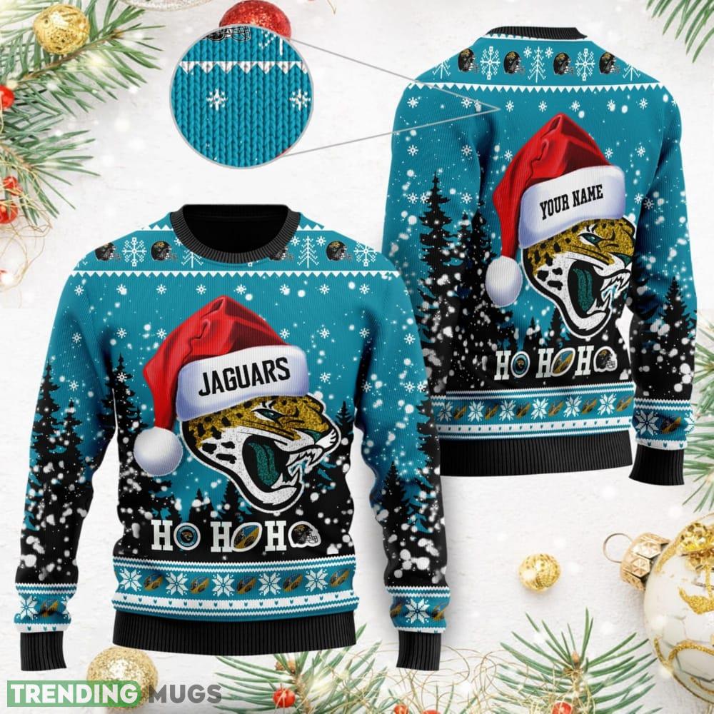 Custom Name Jacksonville Jaguars Symbol Wearing Santa Claus Hat Ho Ho Ho All Over Print Sweater Gift Christmas – Custom Name Jacksonville Jaguars Symbol Wearing Santa Claus Hat Ho Ho Ho All Over Print Sweater Gift Christmas