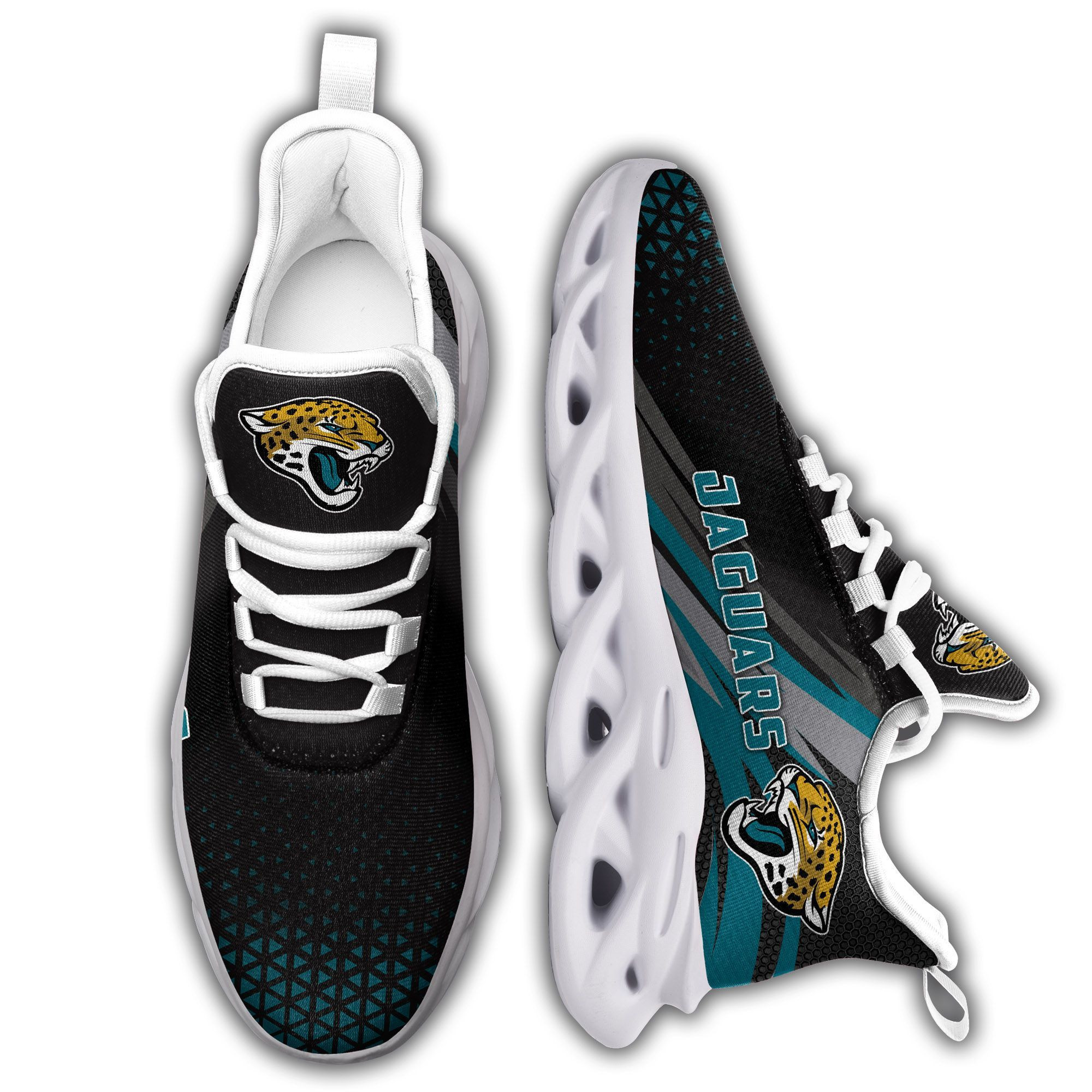 Join the ranks of loyal Jacksonville Jaguars supporters and make a bold statement with our Custom Name Jacksonville Jaguars Triangle Custom Max Soul Sneakers. Step into game day with confidence and let your passion for football shine through!