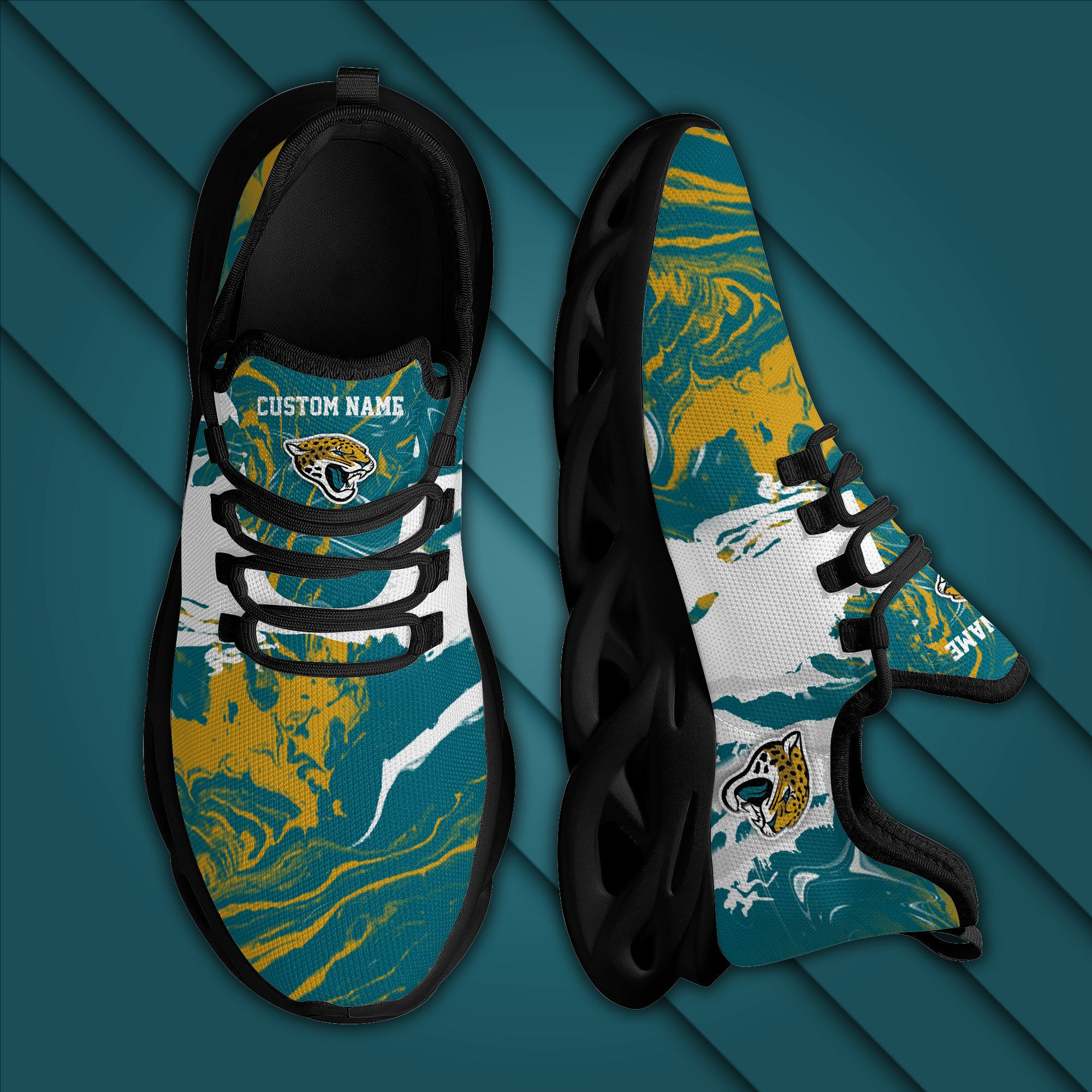 This Custom Name Jacksonville Jaguarsamerican Football Team Trending Max Soul Clunky Sneaker Shoes For Men Women is a breathable, lightweight, and comfortable casual outdoor shoe that has a unique design. It is made of a mesh fabric which makes it sweat absorbent and breathable, while the rubber bottom ensures traction, comfort, and durability. It is available in two colors: black or white sole. There are two styles of shoelace holes so you can choose your preference.