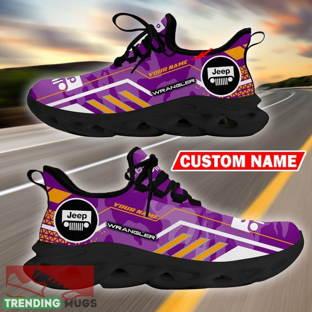 Not only do these sneakers showcase your love for racing cars and motorcycles, but they also reflect your individuality and style. Stand out from the crowd and let your footwear do the talking with our Custom Name Jeep Wrangler Logo Camo Purple Max Soul Sneakers.