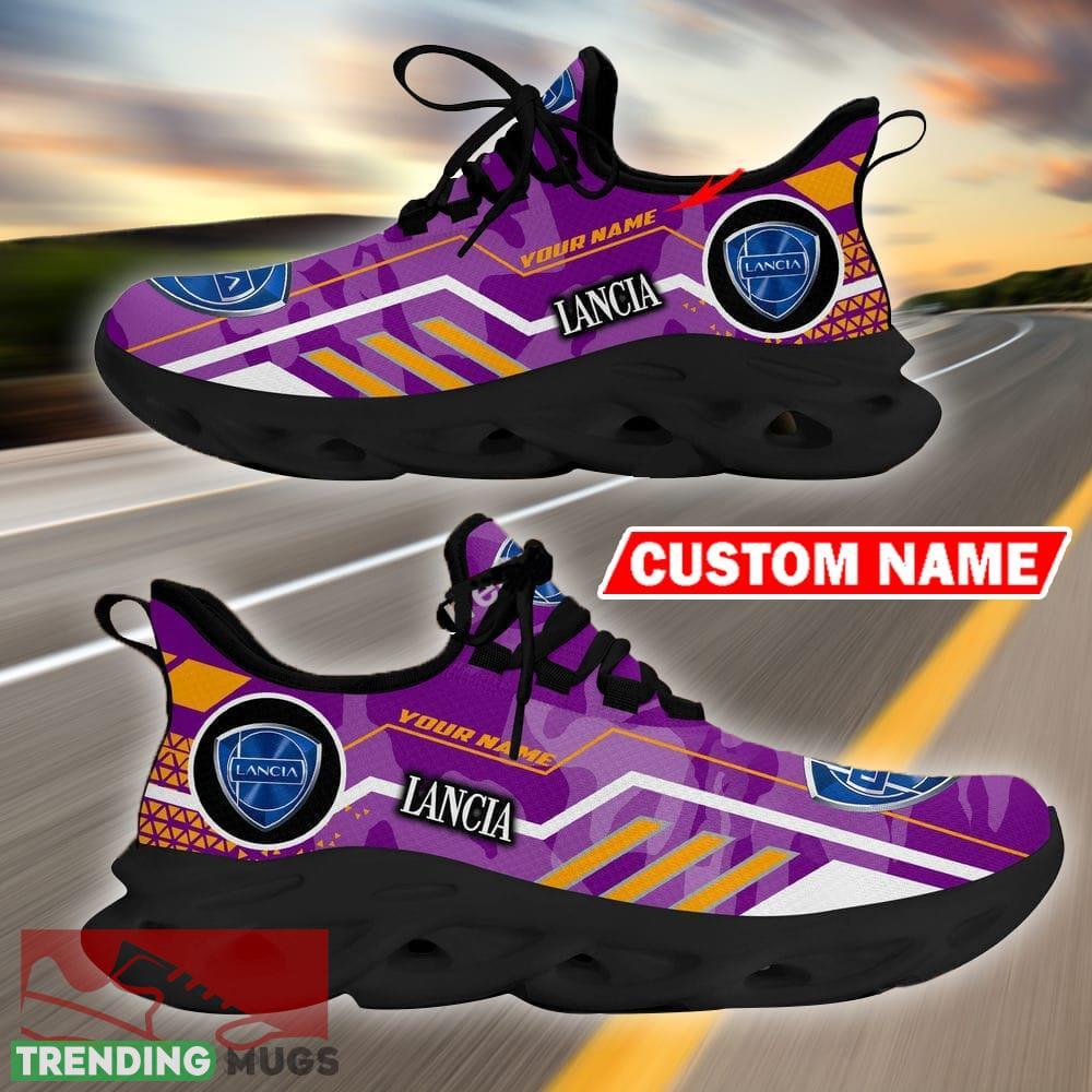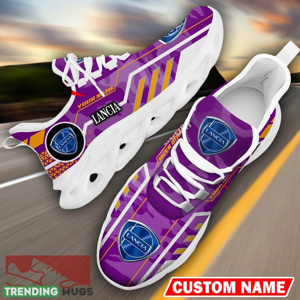 Step into the fast lane of style with our Custom Name Lancia Logo Camo Purple Max Soul Sneakers. These one-of-a-kind racing car and motorcycle inspired chunky sneakers are the perfect addition to any sneaker collection.