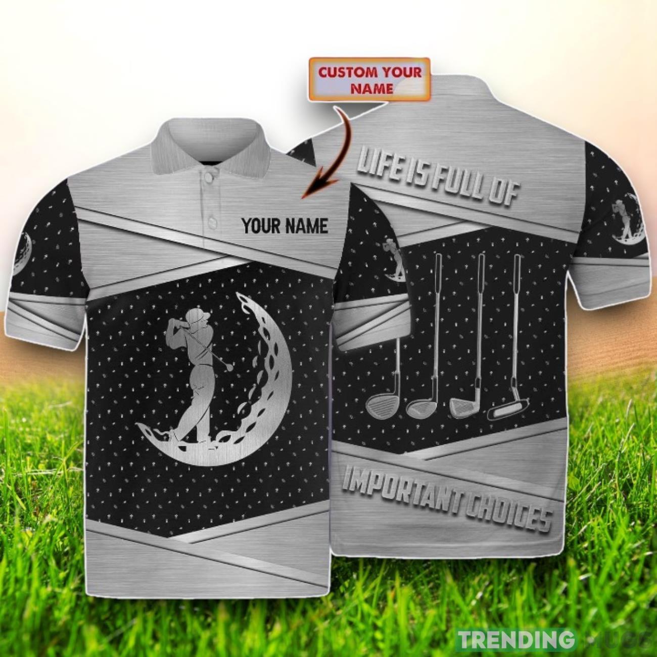Don’t miss out on the opportunity to elevate your golfing wardrobe with this one-of-a-kind polo shirt. Embrace the power of personalization and let your style shine through. Order your Custom Name Life Is Full Of Important Choices Golf Silver Golf Balls And Sticks Polo Shirt today and take your golfing experience to new heights!