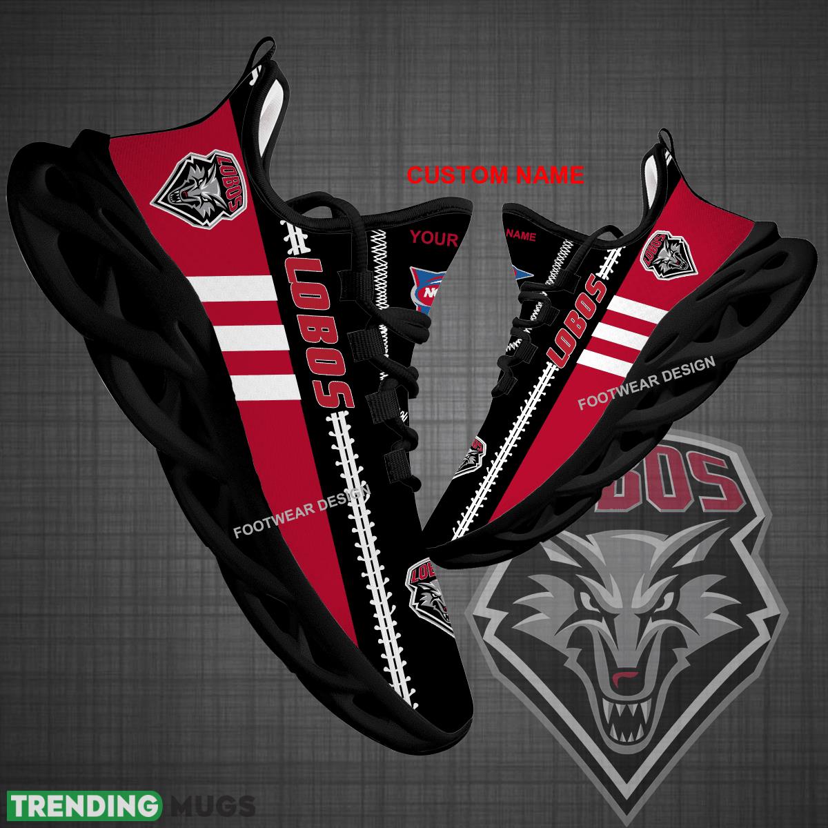 This Custom Name NCAA New Mexico Lobos Logo New Max Soul Shoes For Big Fans Runing Sneakers Gift is a breathable, lightweight, and comfortable casual outdoor shoe that has a unique design. It is made of a mesh fabric which makes it sweat absorbent and breathable, while the rubber bottom ensures traction, comfort, and durability. It is available in two colors: black or white sole. There are two styles of shoelace holes so you can choose your preference.