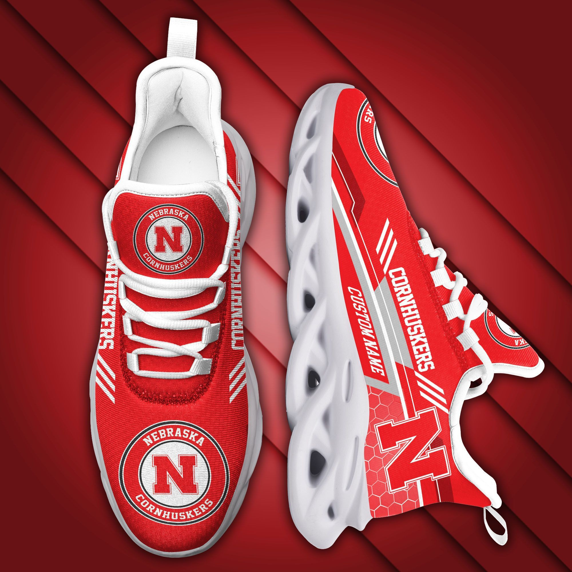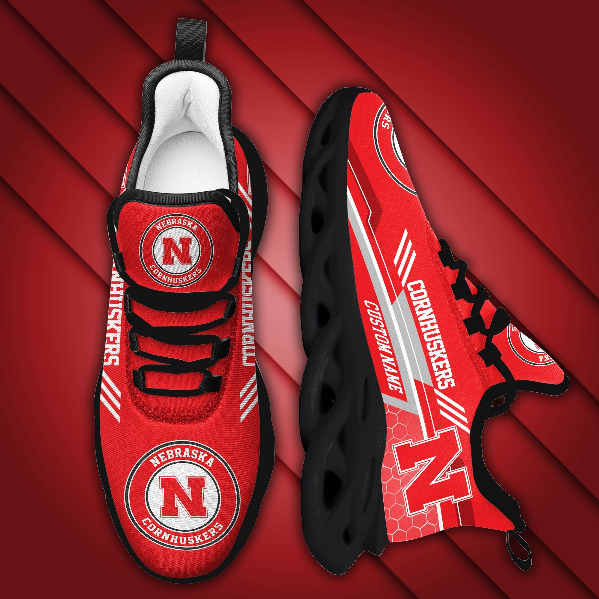 This Custom Name Nebraska Cornhuskers Custom Max Soul Sneakers For Men Women Football Fan Football Fan University Of NebraskaLincoln is a breathable, lightweight, and comfortable casual outdoor shoe that has a unique design. It is made of a mesh fabric which makes it sweat absorbent and breathable, while the rubber bottom ensures traction, comfort, and durability. It is available in two colors: black or white sole. There are two styles of shoelace holes so you can choose your preference.