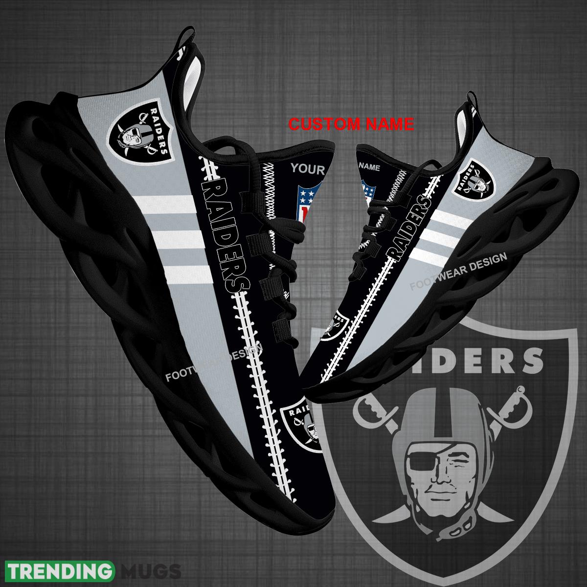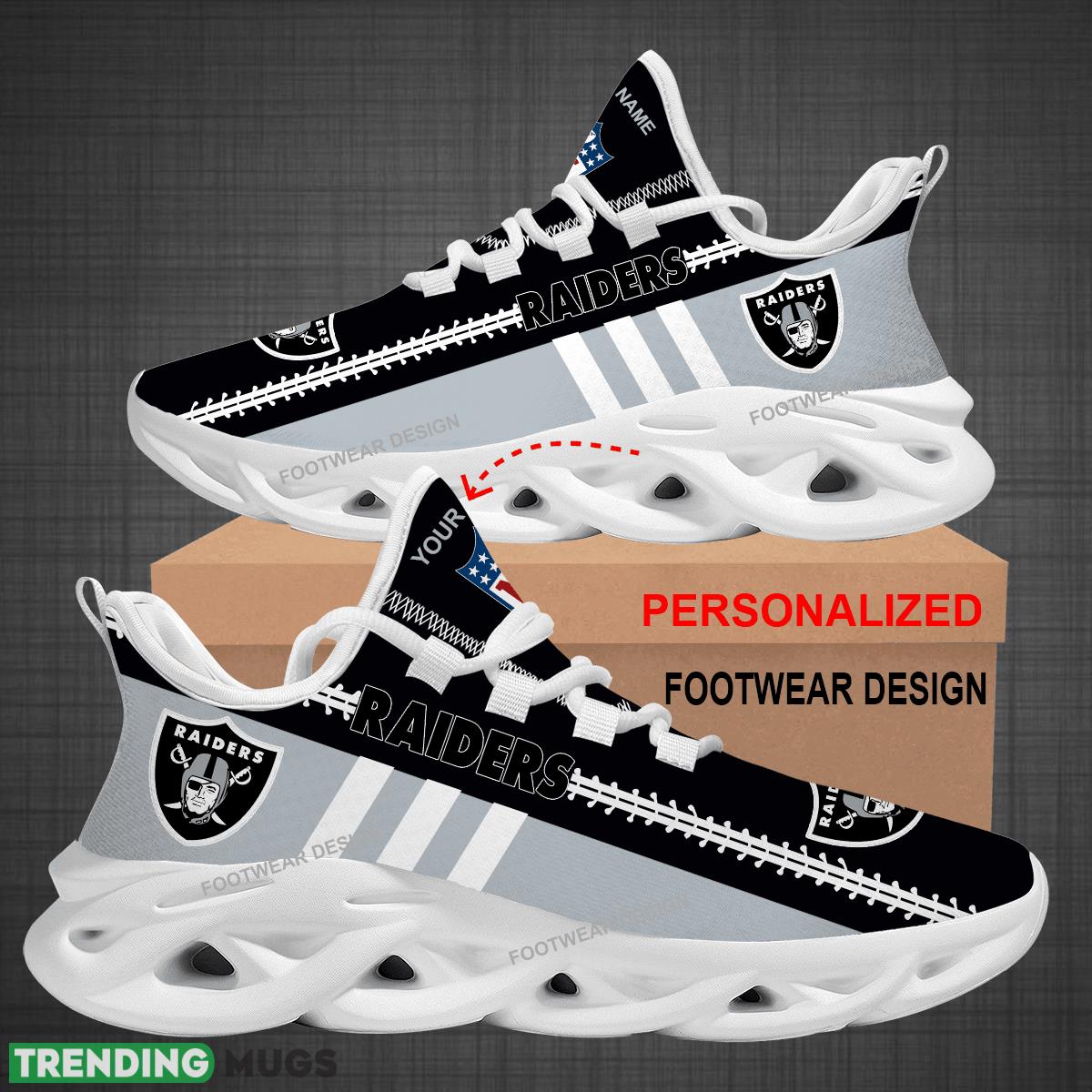 Elevate your game day style with our Custom Name NFL Las Vegas Raiders Logo New Max Soul Shoes For Big Fans! These sleek and stylish sneakers are perfect for running or cheering on your favorite team. Made for ultimate comfort and support, these shoes are a must-have for any die-hard Raiders fan. Personalize them with your name to show off your team spirit in a unique way. Whether you’re hitting the pavement or the stadium, these shoes are sure to turn heads and make a statement. Treat yourself or surprise a fellow fan with the perfect gift that they’ll love and cherish. Get ready to step up your game day look with these one-of-a-kind Raiders sneakers!
