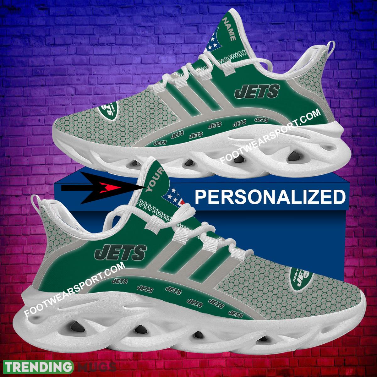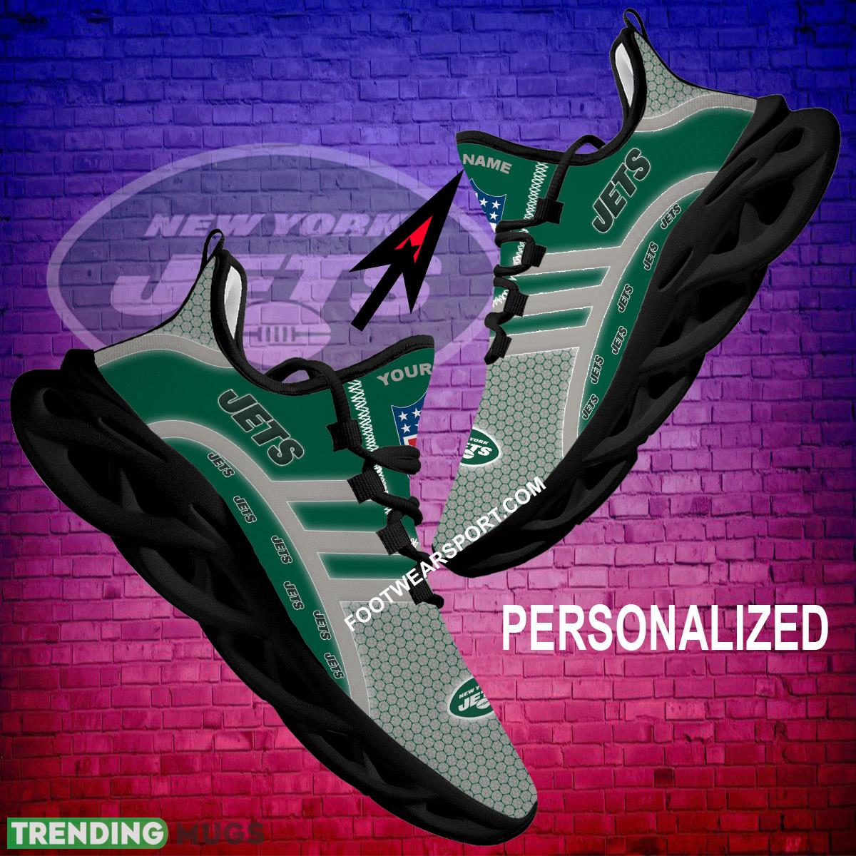 This Custom Name NFL New York Jets Chunky Sneaker Visual For Men Women Fans Max Soul Shoes is a breathable, lightweight, and comfortable casual outdoor shoe that has a unique design. It is made of a mesh fabric which makes it sweat absorbent and breathable, while the rubber bottom ensures traction, comfort, and durability. It is available in two colors: black or white sole. There are two styles of shoelace holes so you can choose your preference.