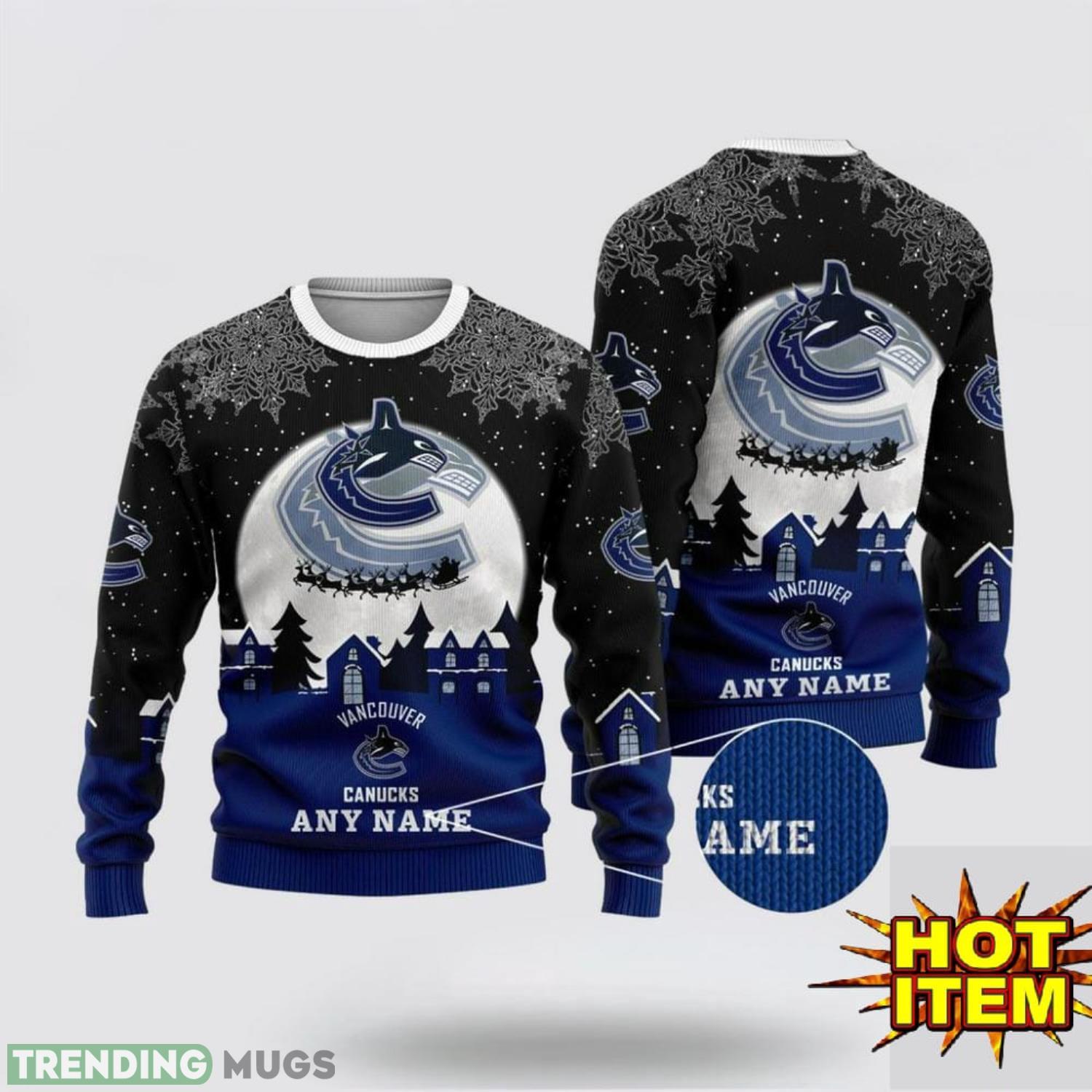 What sets this sweater apart is its customization feature, allowing you to add your own name to the design. Now you can proudly display your support for the Canucks with a personalized touch. Whether you’re attending a holiday party, watching the game from home, or giving it as a gift, this sweater is sure to be a hit!