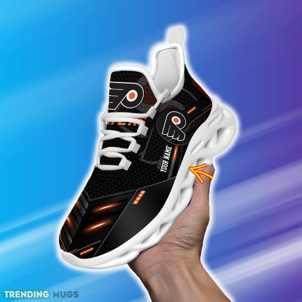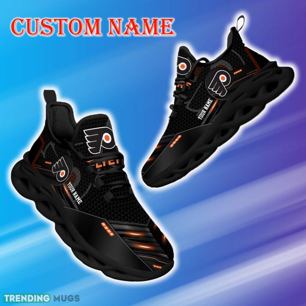 Elevate your game and showcase your love for the Philadelphia Flyers with our Custom Name Philadelphia Flyers NHL Sport Black Max Soul Shoes Visual Gift Fans Running Sneakers. These sleek and stylish shoes are a must-have for any true Flyers fan.
